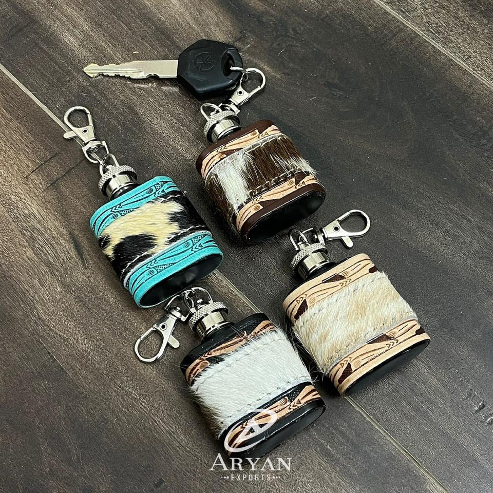 Hand Tooled Cowhide Leather Stainless Steel Flask With Keyring