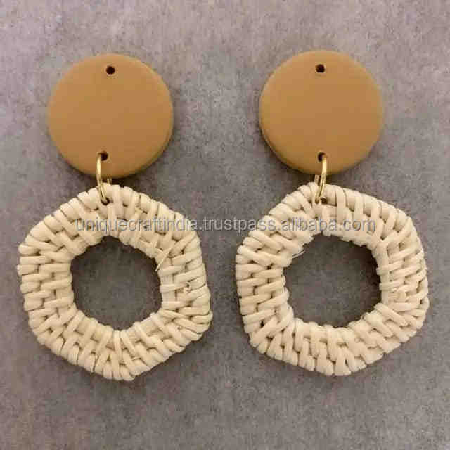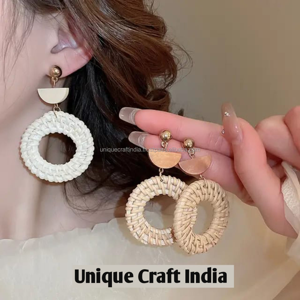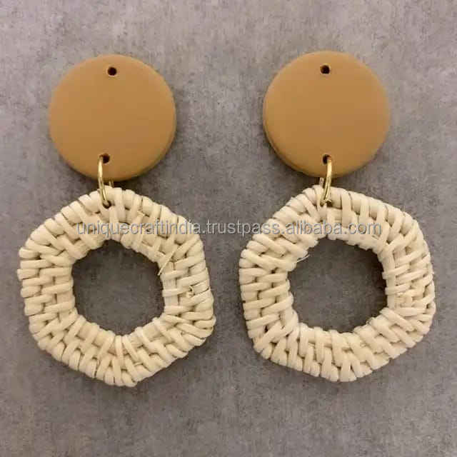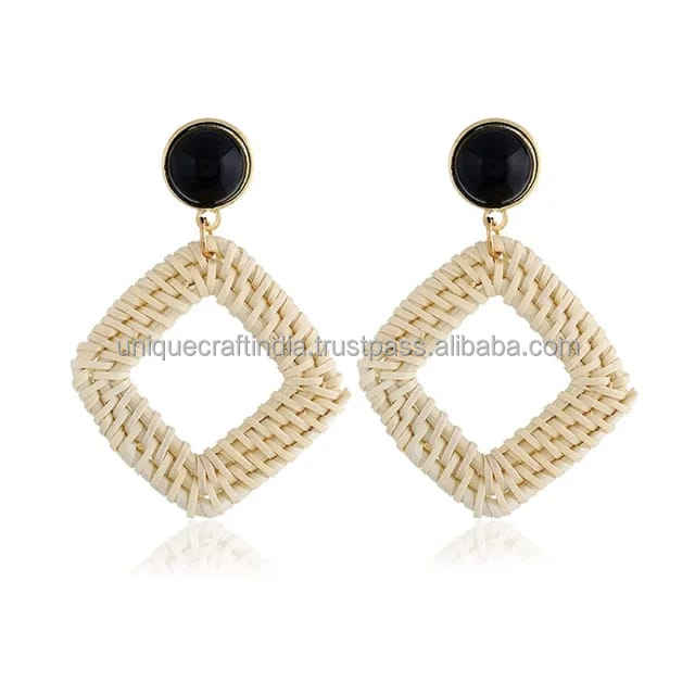 Wholesale Eco-Friendly Handmade Boho Statement Wood Earrings Natural Rattan Knit Straw Stud Drop Earrings Fashionable Stylish