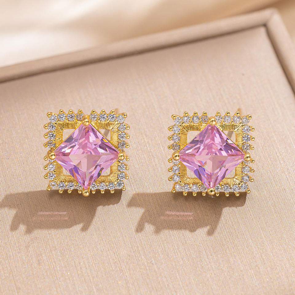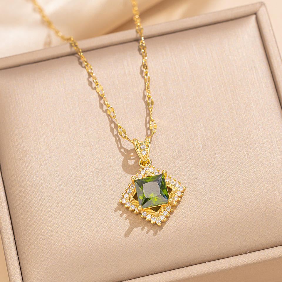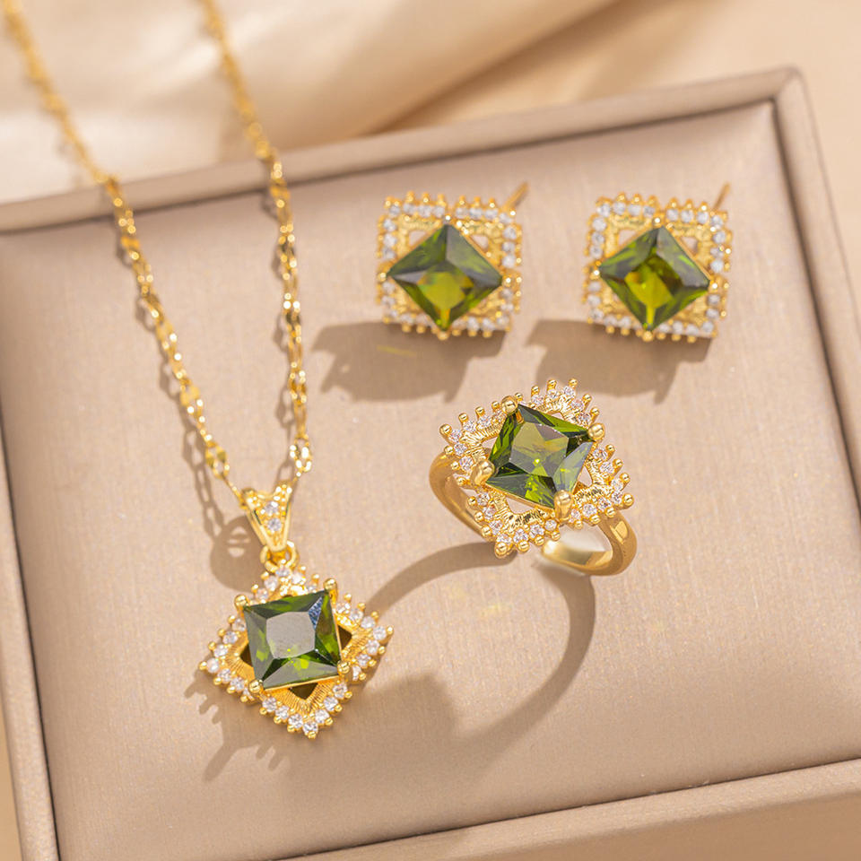Wholesale Elegant Luxury Women Jewelry Set Pink Green Rhinestone Stainless Steel Necklace Adjustable Rings Earrings Set