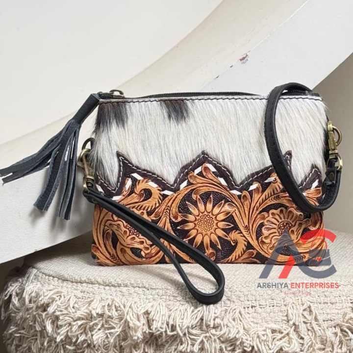 Product Name:Hand Tooled Leather Wristlet Crossbody Tassel Pouch