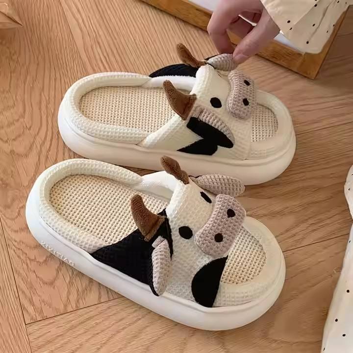 Wholesale Fashion 2025 Custom Cute Cartoon Cow Design EVA Outsole Soft Cotton Linen Home Sandals Slippers for Women and Ladies