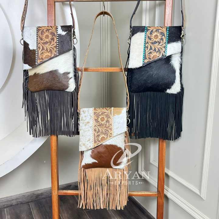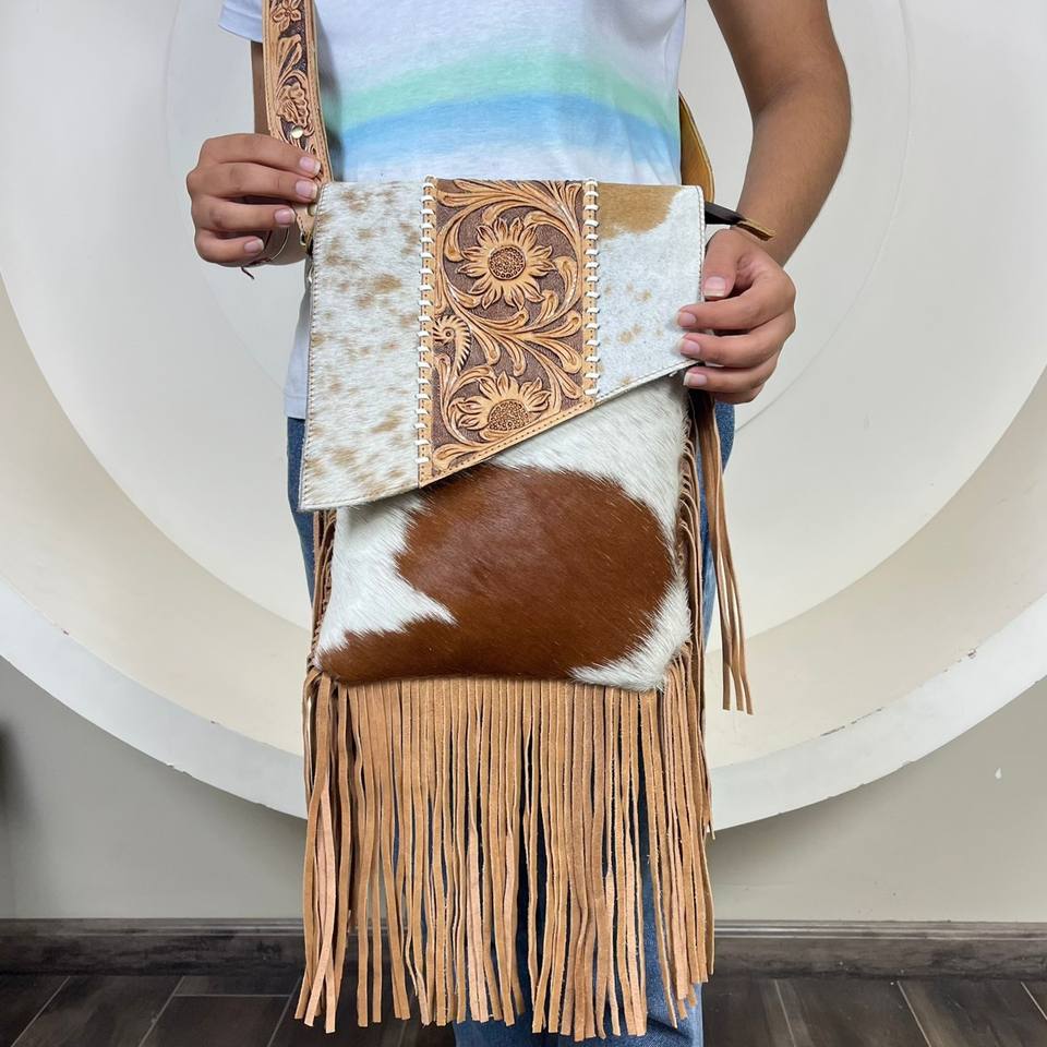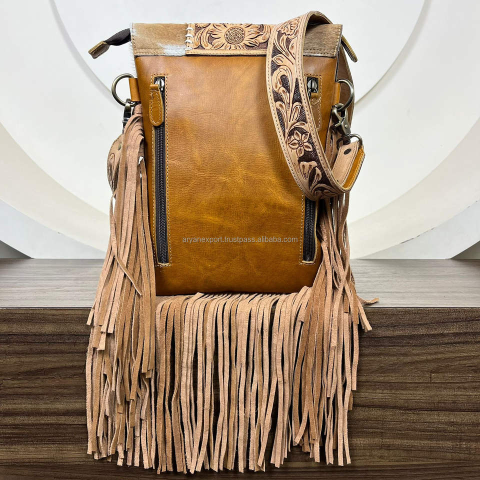 Product Name:Hand Tooled Cowhide Leather Fringe Crossbody Bag