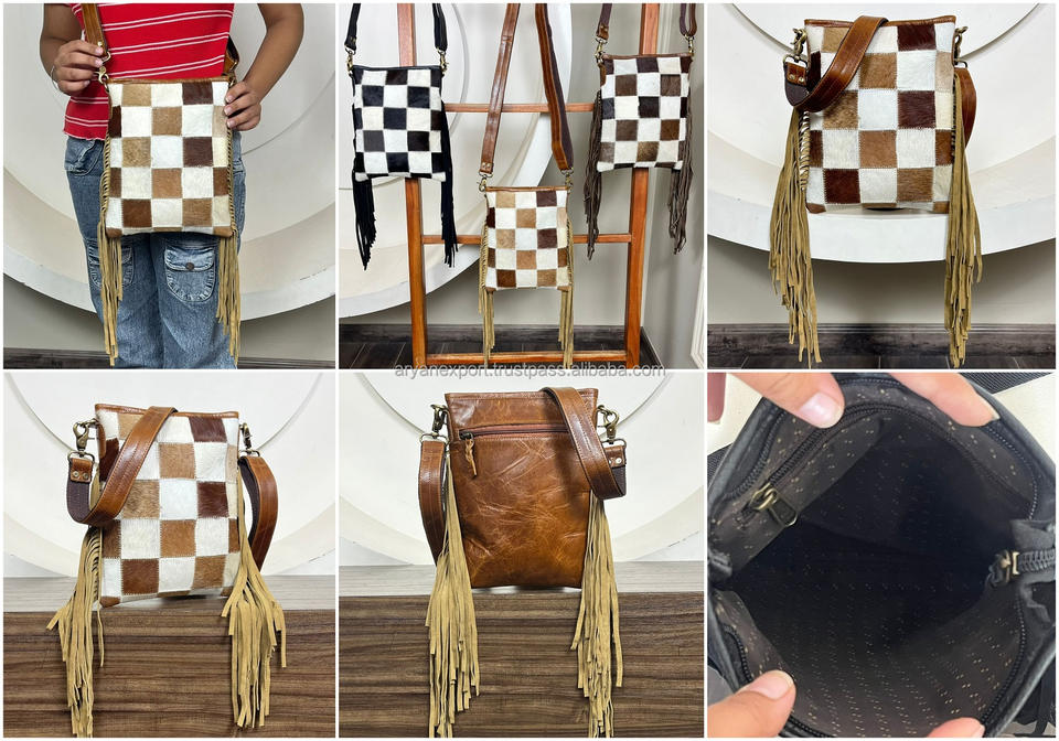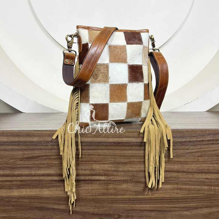 Wholesale Fashion Luxury Hair On Cowhide Crossbody Fringe Bags Checkered Board Design Handbags With Adjustable Strap for Women's