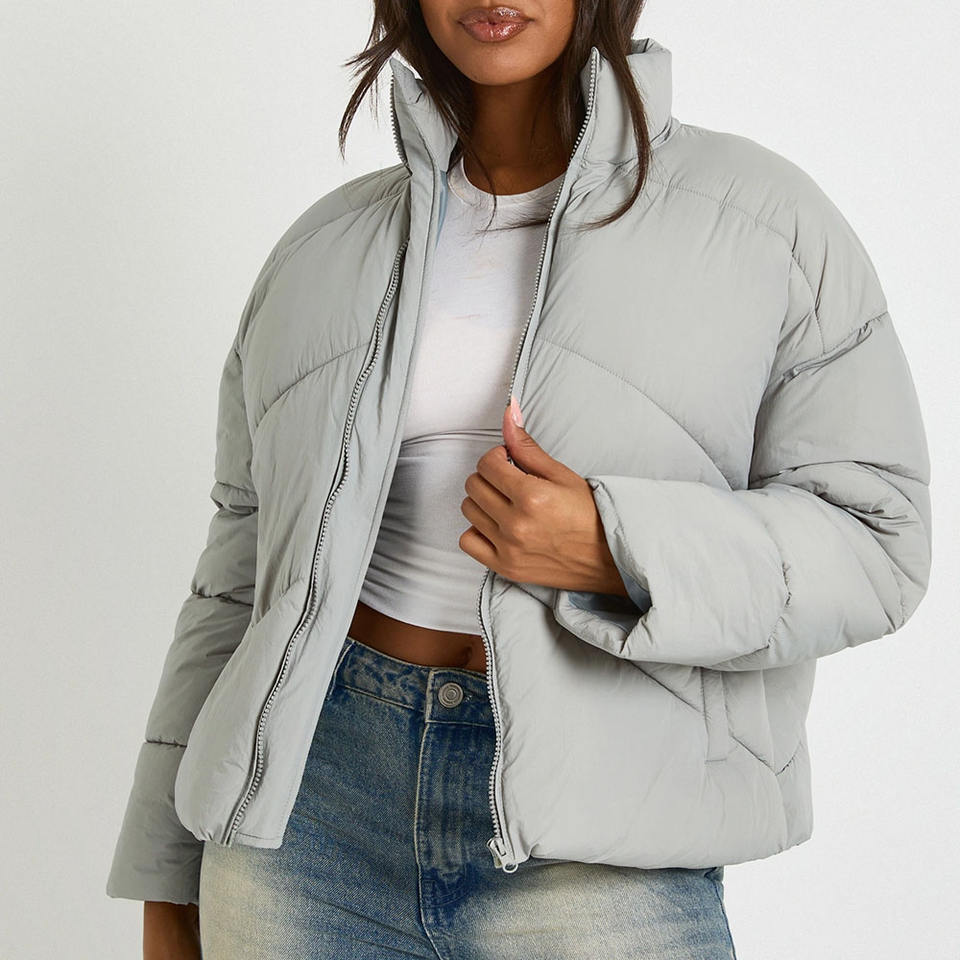 Wholesale Fashion Women Crop Light Grey Short Quilted Puffer Jacket Nylon Winter Warm Coat Custom Logo Ladies Outerwear Jacket