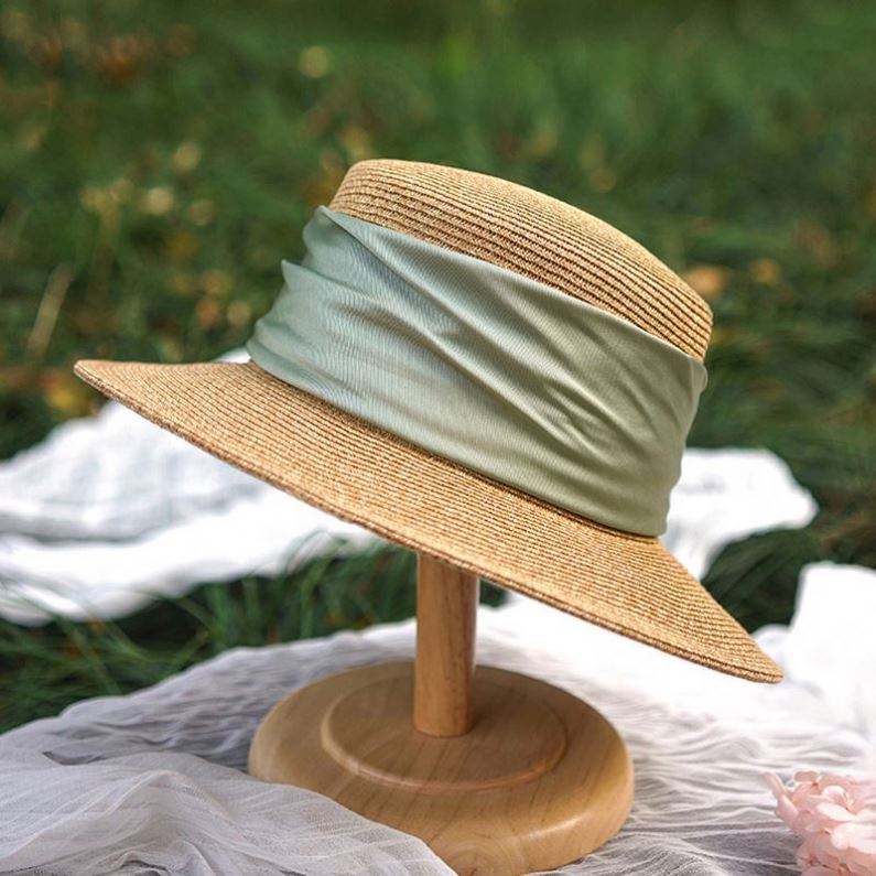 Wholesale Female Straw Hat With Satin Ribbon Wide Brim Sun Beach Hat Summer French Flat Top Bowler Straw Hat