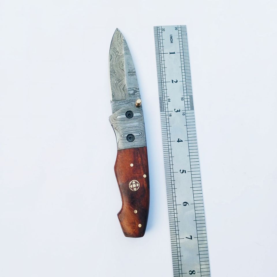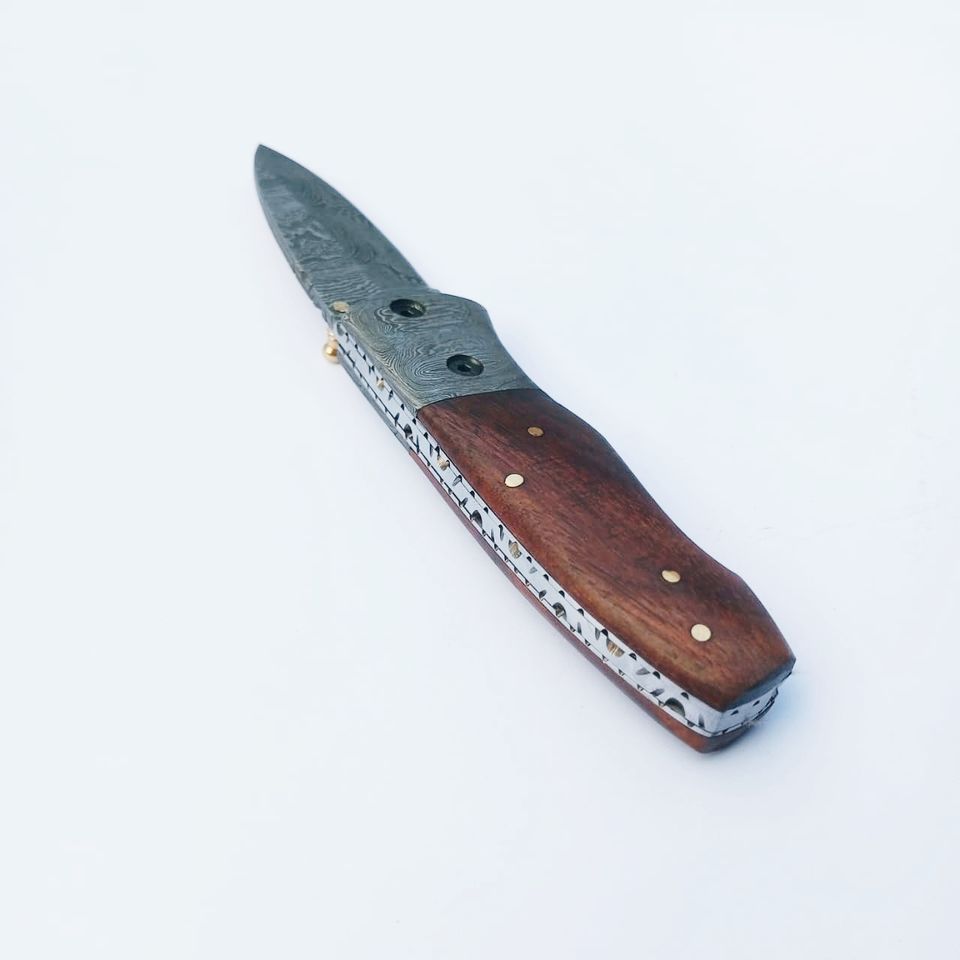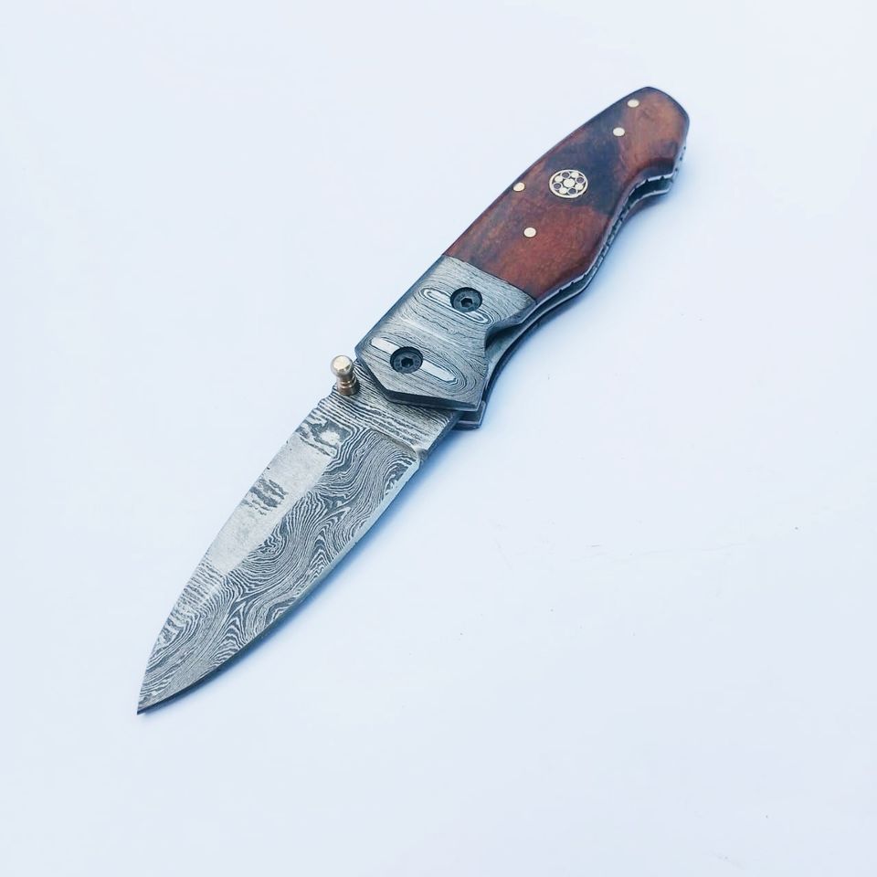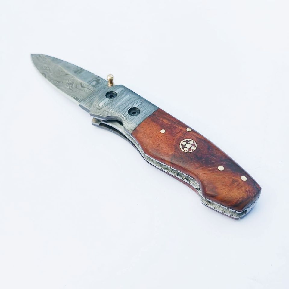 Wholesale Full Damascus Steel Inner Lock Folding Knife DIY Grade OEM Customizable Wood Leather Sheath for Outdoor Pocket Use