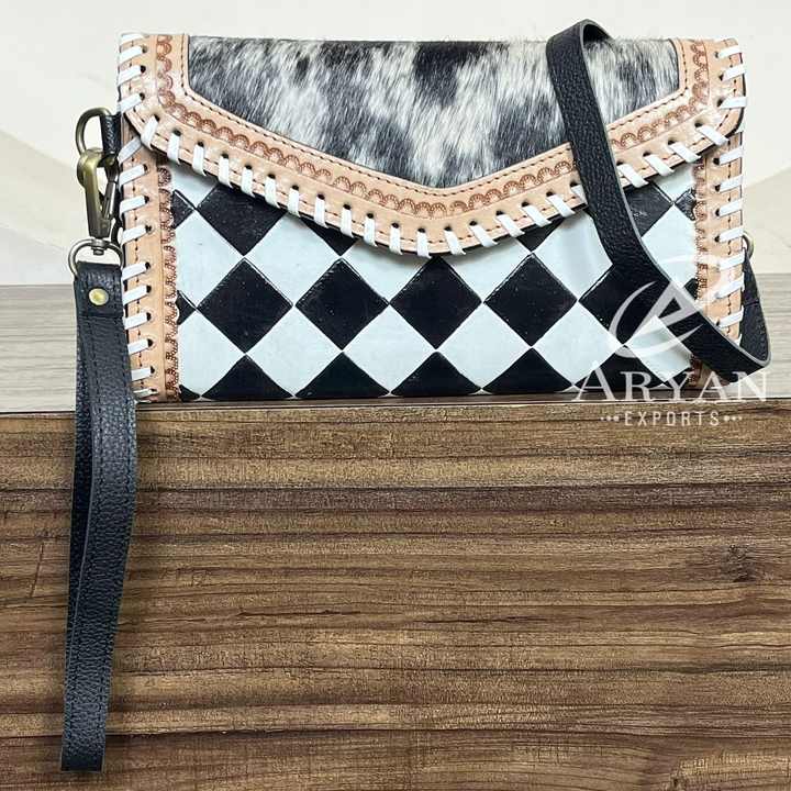 Wholesale Genuine Black & White Checkerboard Cowhide Tooled Leather Western Clutch Purse Wristlet Crossbody Mini Bag for Women's