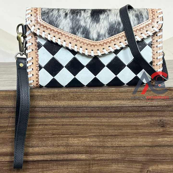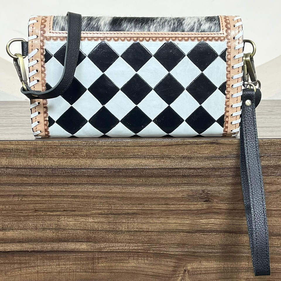 Wholesale Genuine Black & White Checkerboard Cowhide Tooled Leather Western Clutch Purse Wristlet Crossbody Mini Bag for Women's