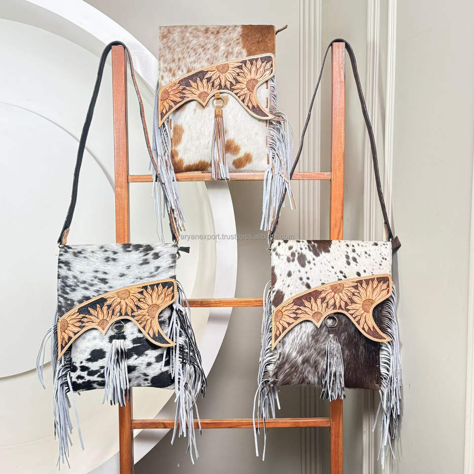 Product name:Hand Tooled Cowhide Leather Fringe Crossbody Bag