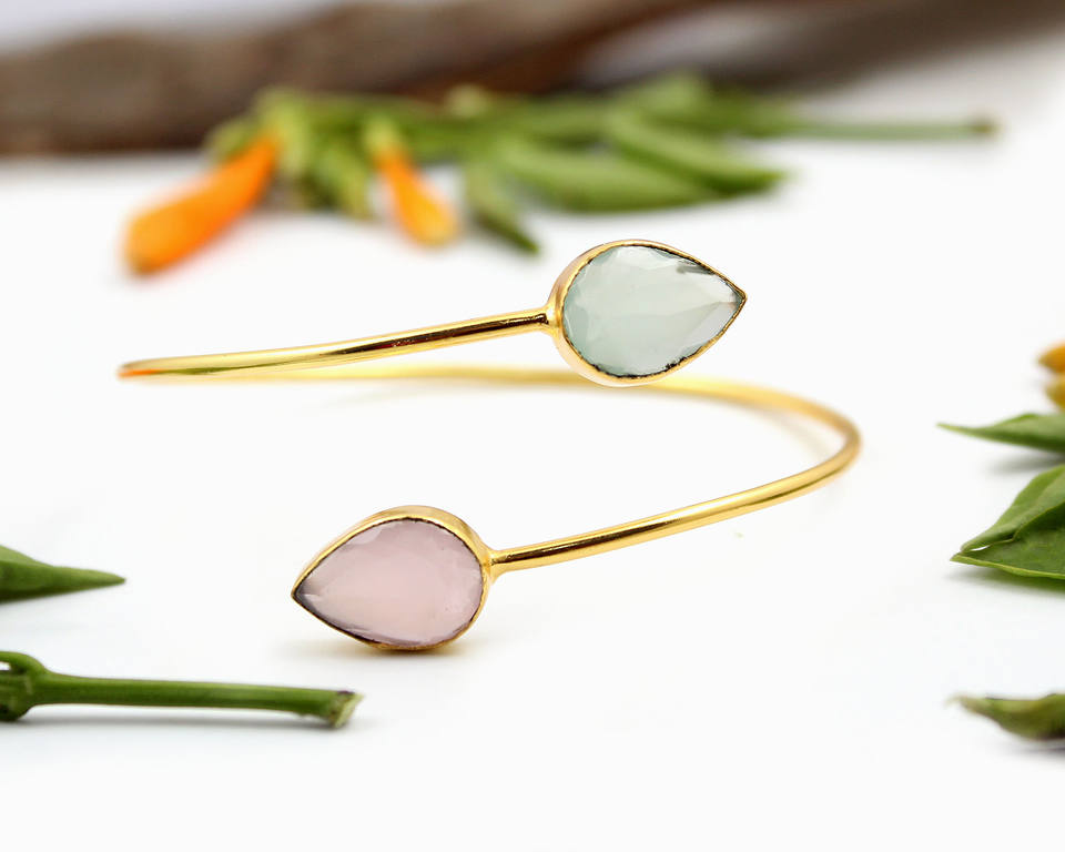 Wholesale Gold Plated Brass Material Aquamarine Pink Chalcedony Double Stone Leaf Bracelet Adjustable Bangle Birthstone Bangle