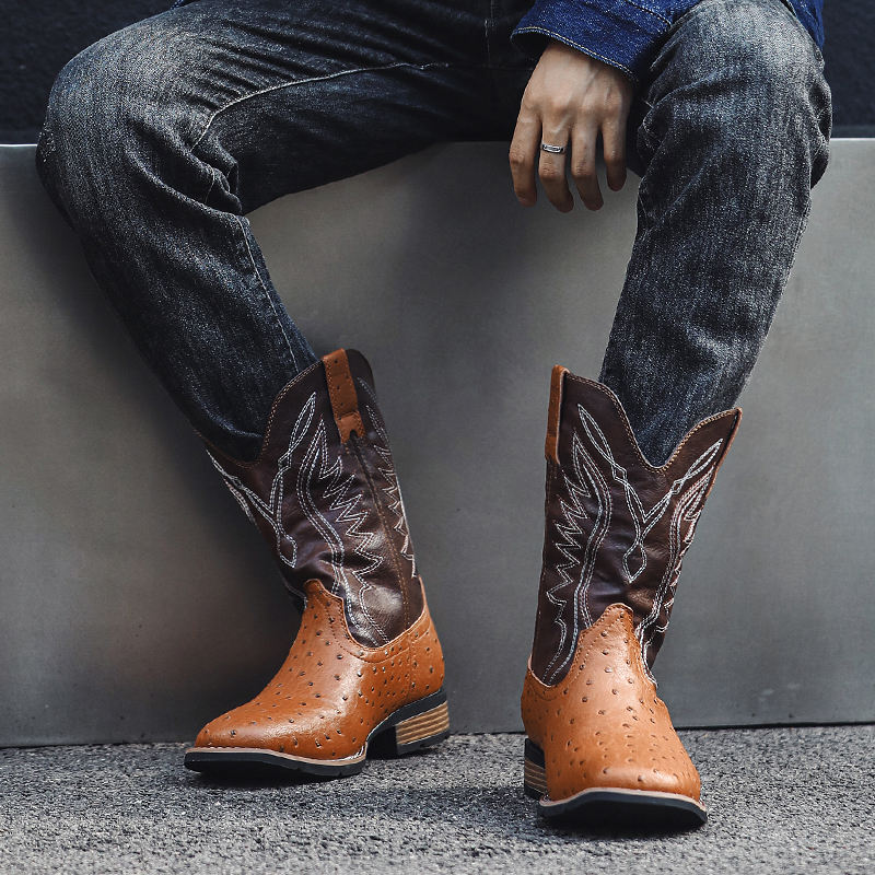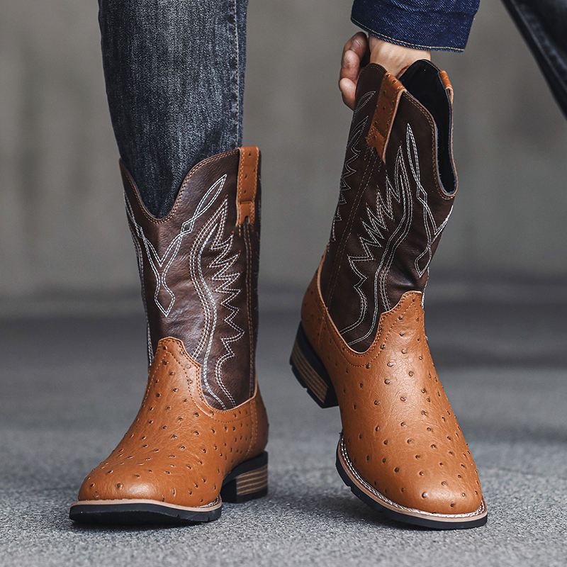 Wholesale Cheap Men's PU Cowboy Boots Slip-On Closure Autumn Fashion Mexico Design Custom Factory