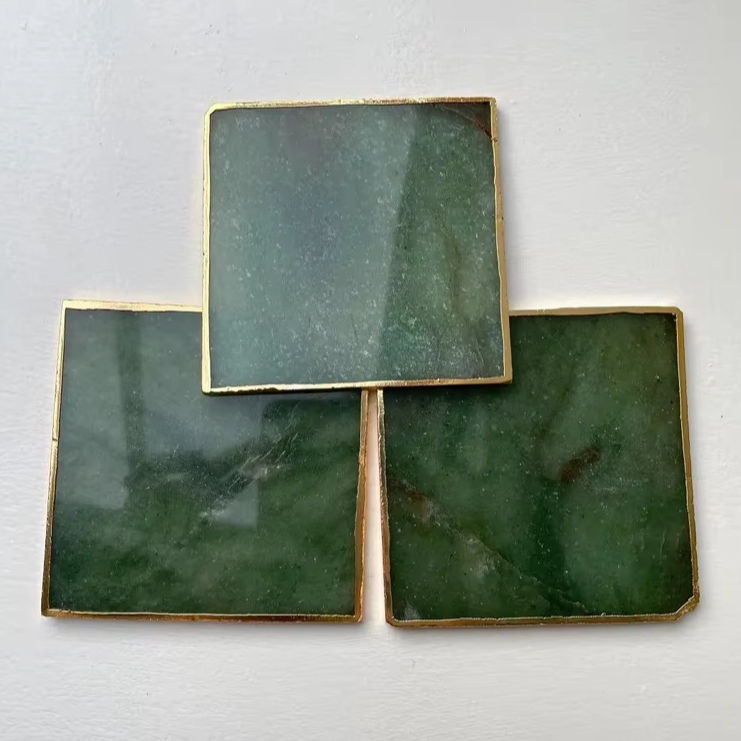 Wholesale Modern Feng Shui Decor Coaster Set Green Aventurine Polished Crystal Gemstone Gold Plating Square Drinks Platters
