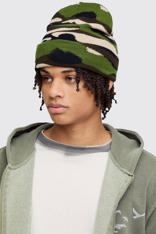 Wholesale Green Camo Knit Beanie Hat Unisex Streetwear Winter Warm Skull Cap Jacquard Camouflage Print Folded Edge 3D Embroidery
