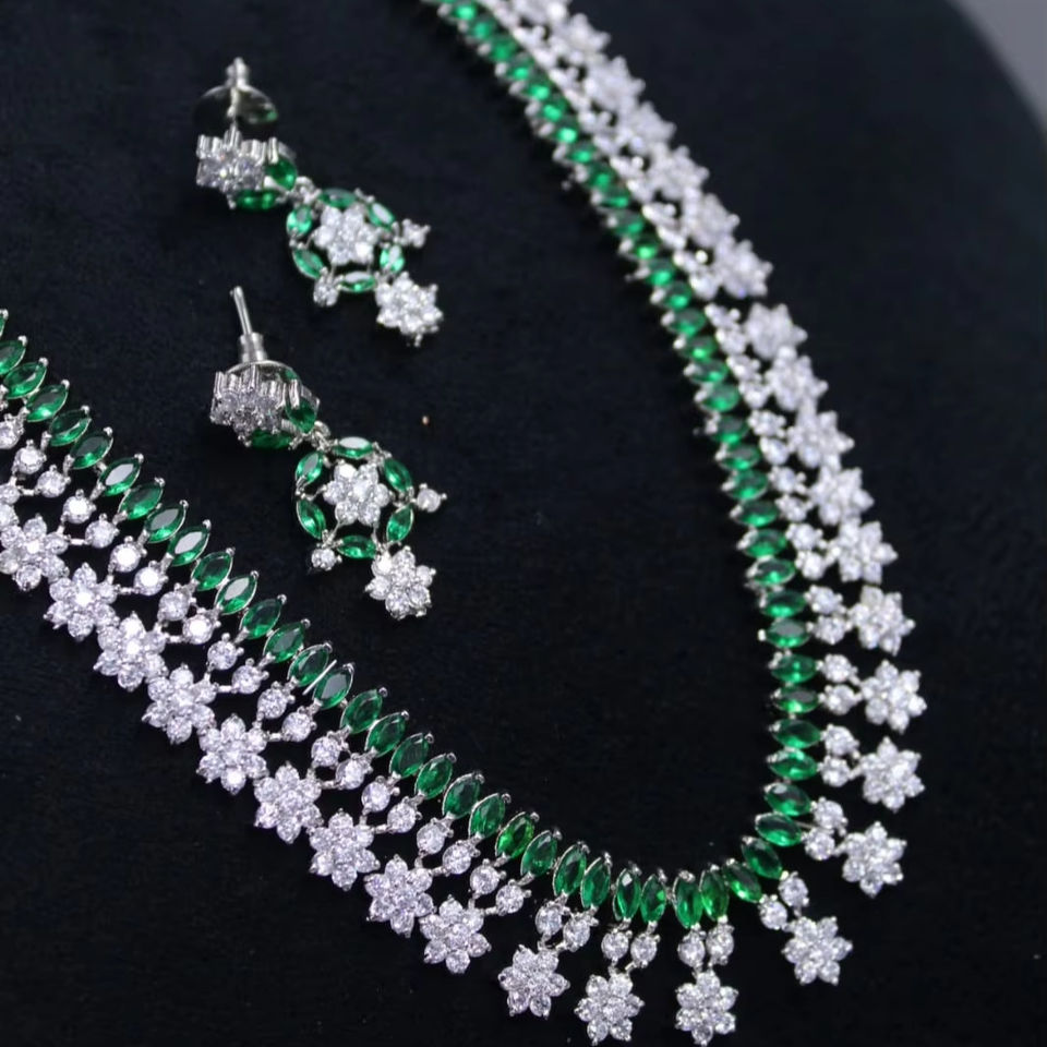 Wholesale Green & White Unique Stylish Brass Necklace with Silver AD CZ and Pearl for Brides Weddings Supplier of Bulk Products