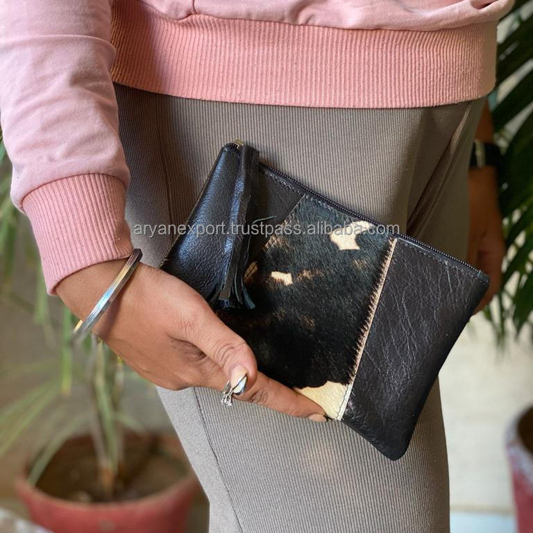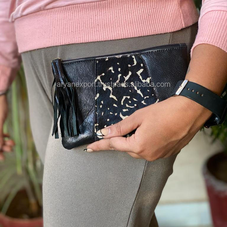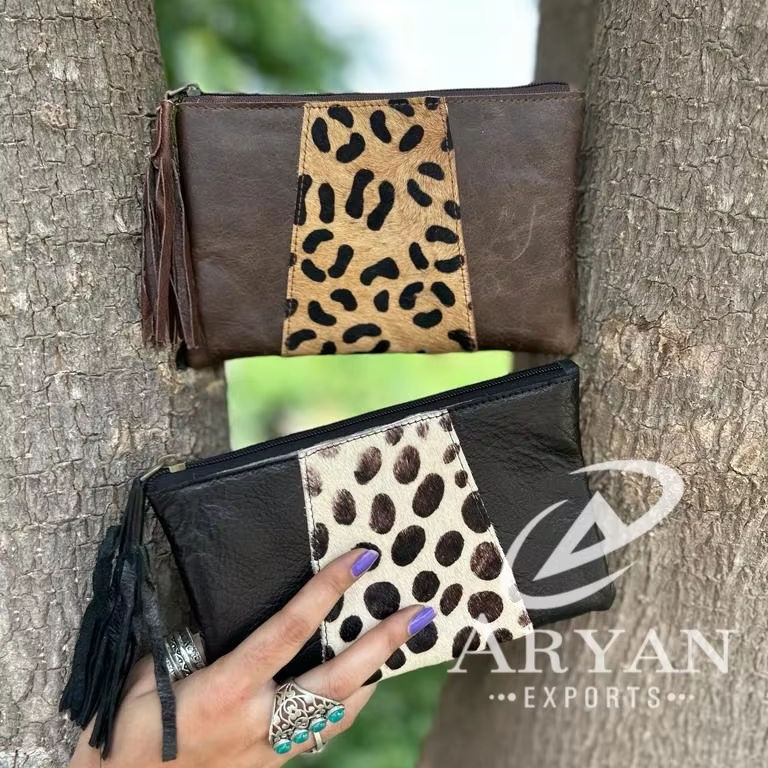 Wholesale Hair on Animal Print Genuine Cowhide Leather Tassel Zipper Pouch for Women's High Quality Luxury Designer Clutch Purse