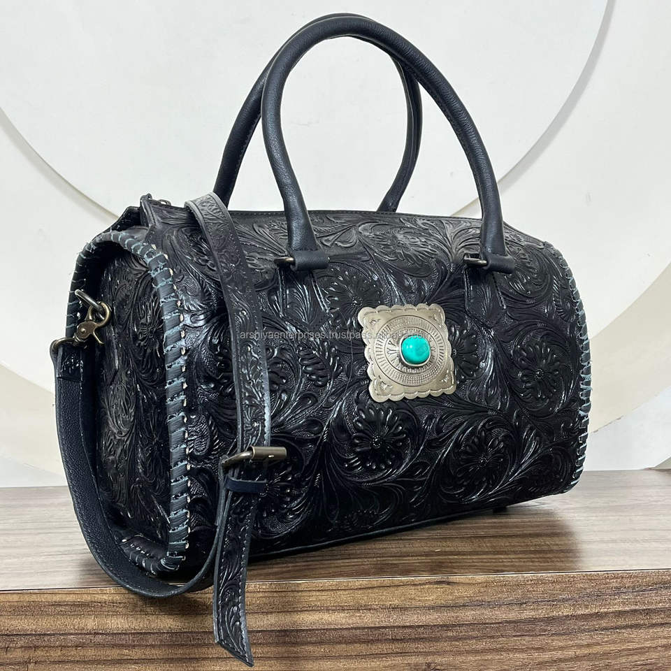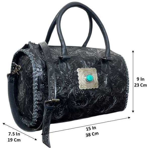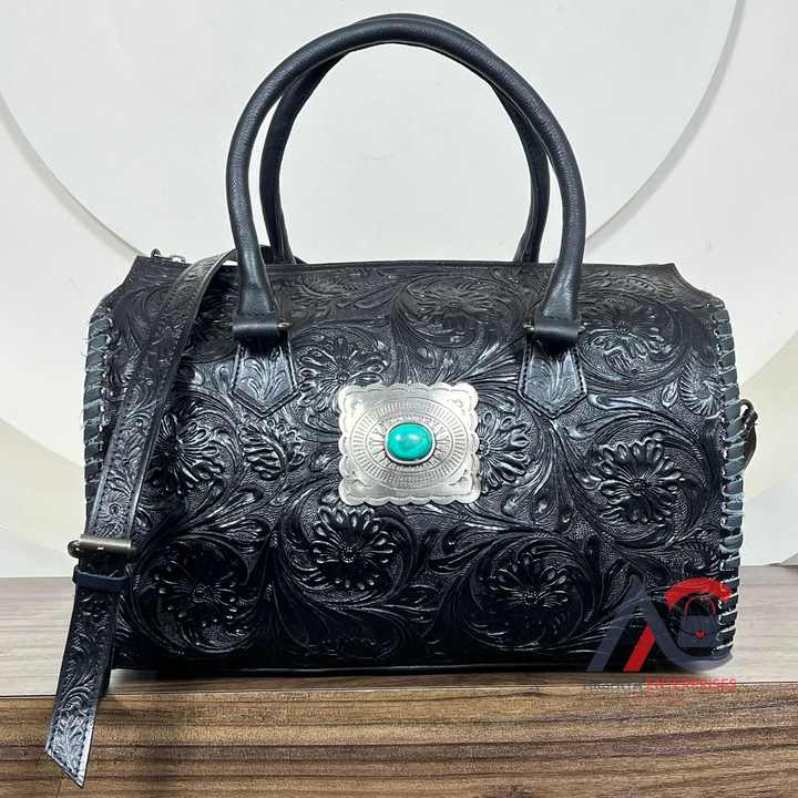 Wholesale Hand-Tooled Black Genuine Leather Western Speedy Duffel Bag with Turquoise Concho Luxury Travel Weekend Overnight Bags