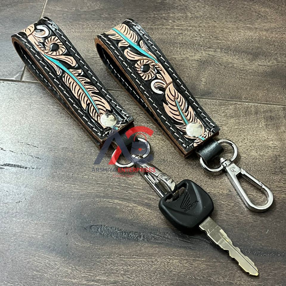 Wholesale Hand Tooled Cow Leather Keychain Best Souvenir Gift Customized Bag Charms Keyrings Trendy Designed wristlet for Unisex