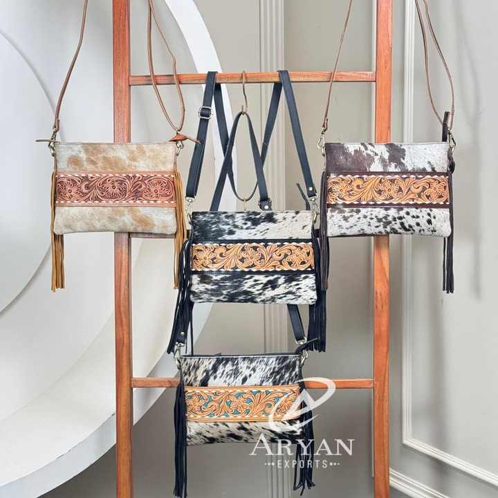 Hand Tooled Cowhide Leather Fringe Crossbody Bag