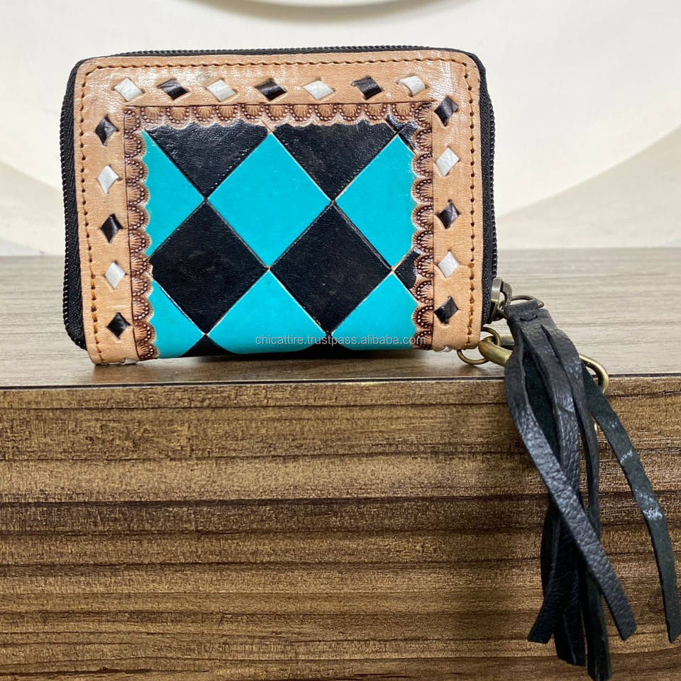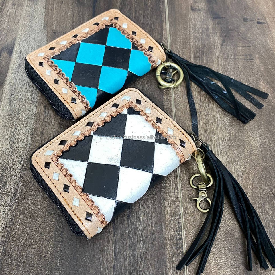 Wholesale Hand Tooled Leather Coin Purse & Card Holders Western Black & Turquoise Checkered Zipper Keychain Wallet with Tassel