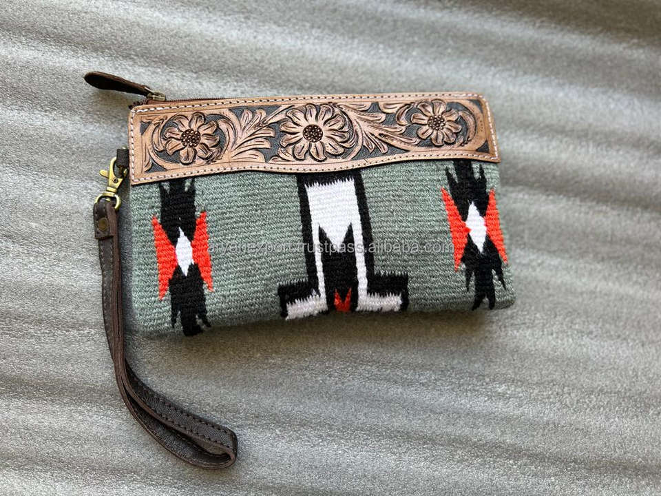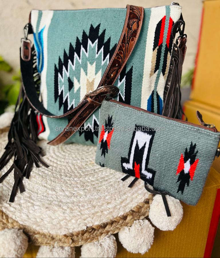 Wholesale Hand Tooled Leather Saddle Blanket Tassel Handbag Stylish Hand Carving Leather Saddle Blanket Wallet Women Combo Set