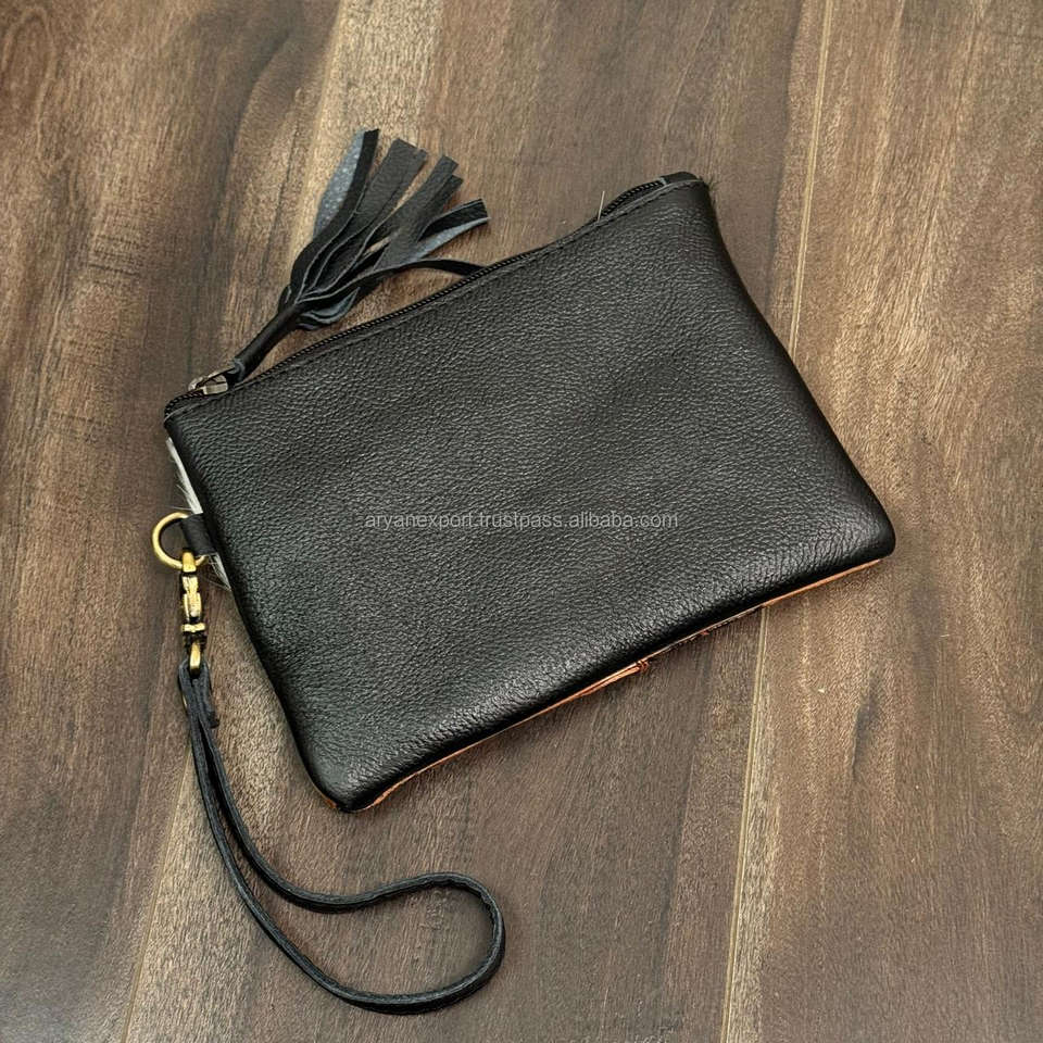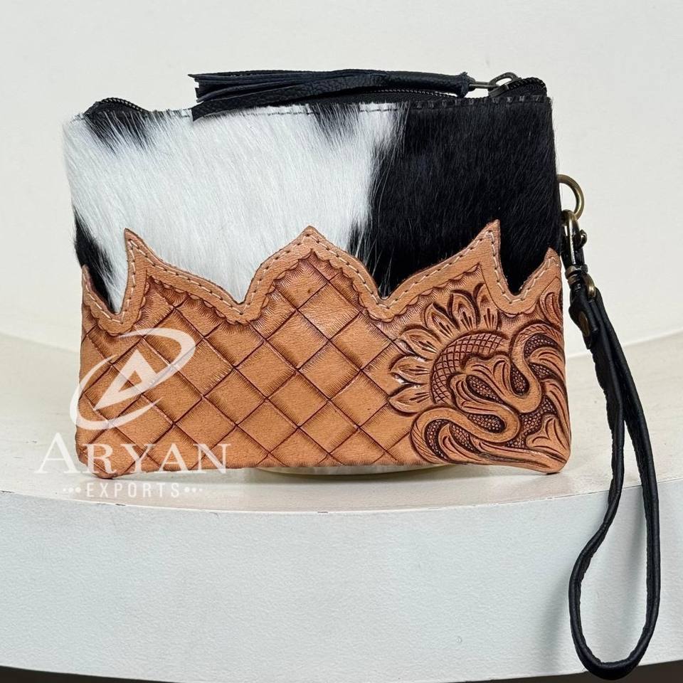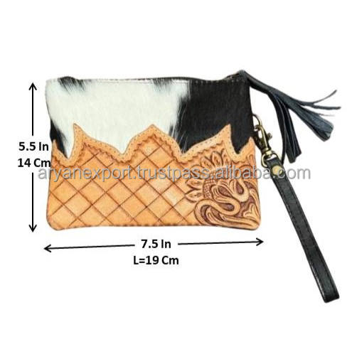 Wholesale Hand Tooled Leather Women Wristlet Pouch Clutch Bag Purse Genuine Cowhide Floral Design Zipper Closure Envelope Clutch