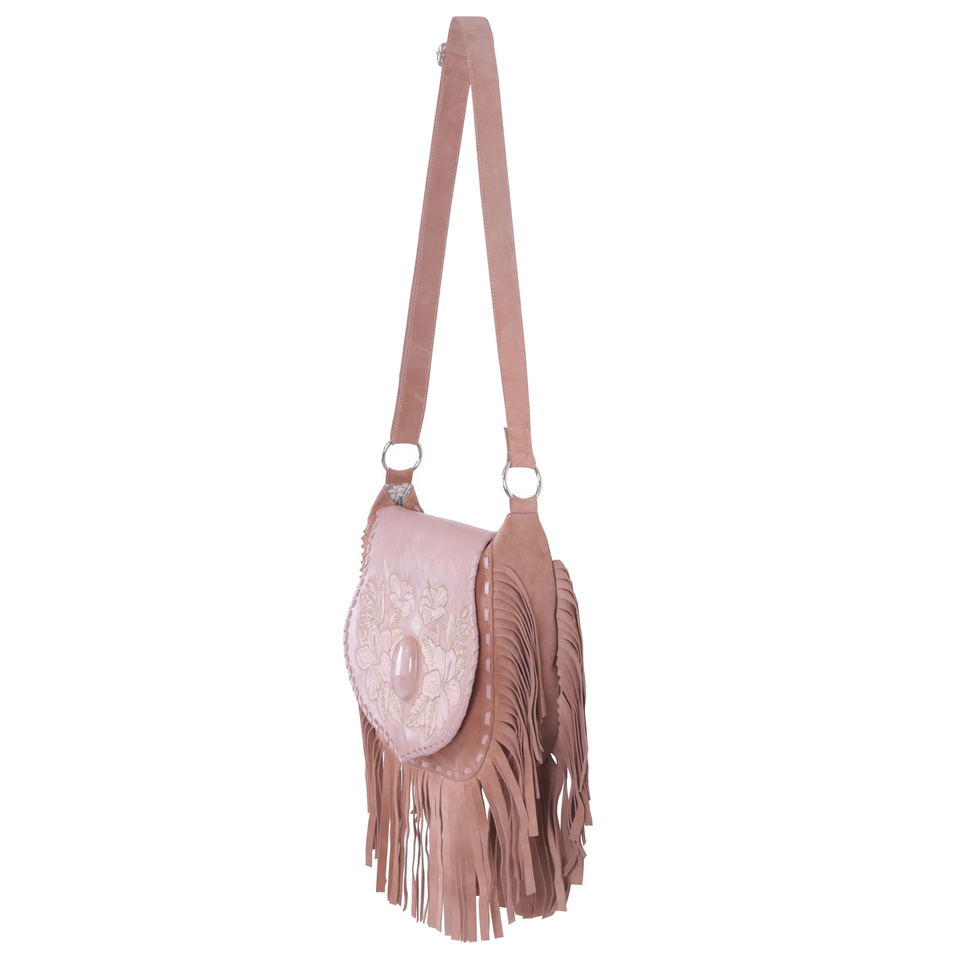 Wholesale Hand-tooled Hibiscus Flowers Surround a Large Genuine Rose Quartz Gemstone on a Cow Leather Flap