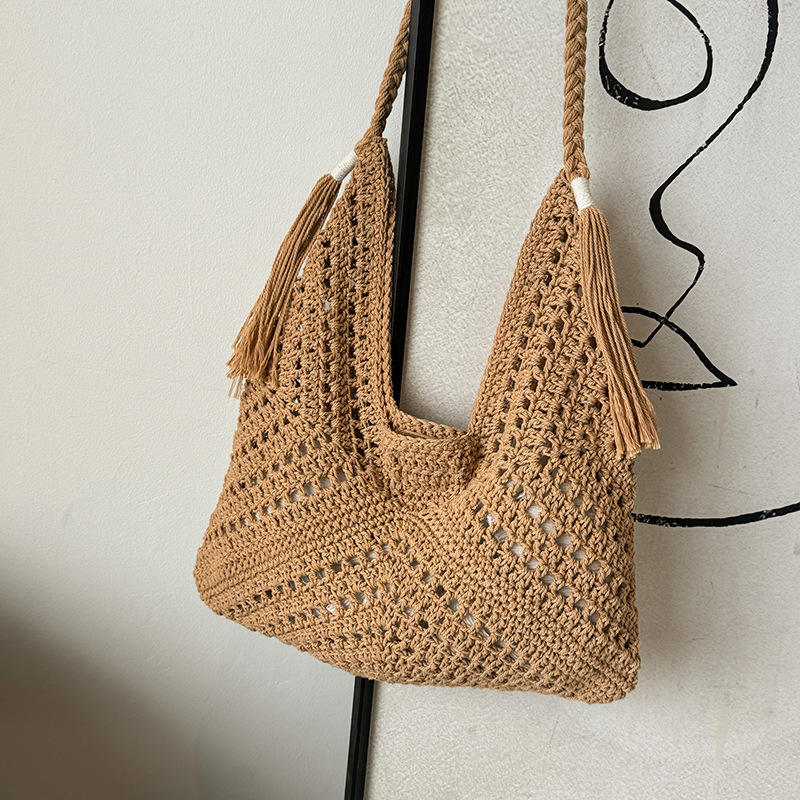 Wholesale Handmade Crochet Cotton Tassel Tote Bag Knitted Women Exquisite Hollow Square Flower Crochet Beach Bag for Summer