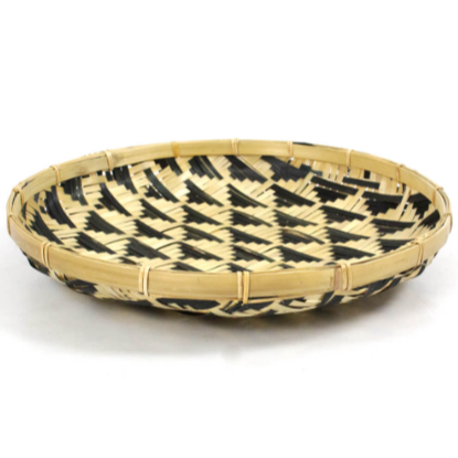 Handmade Flat Bamboo Basket with Black Pattern Woven Decorative Tray