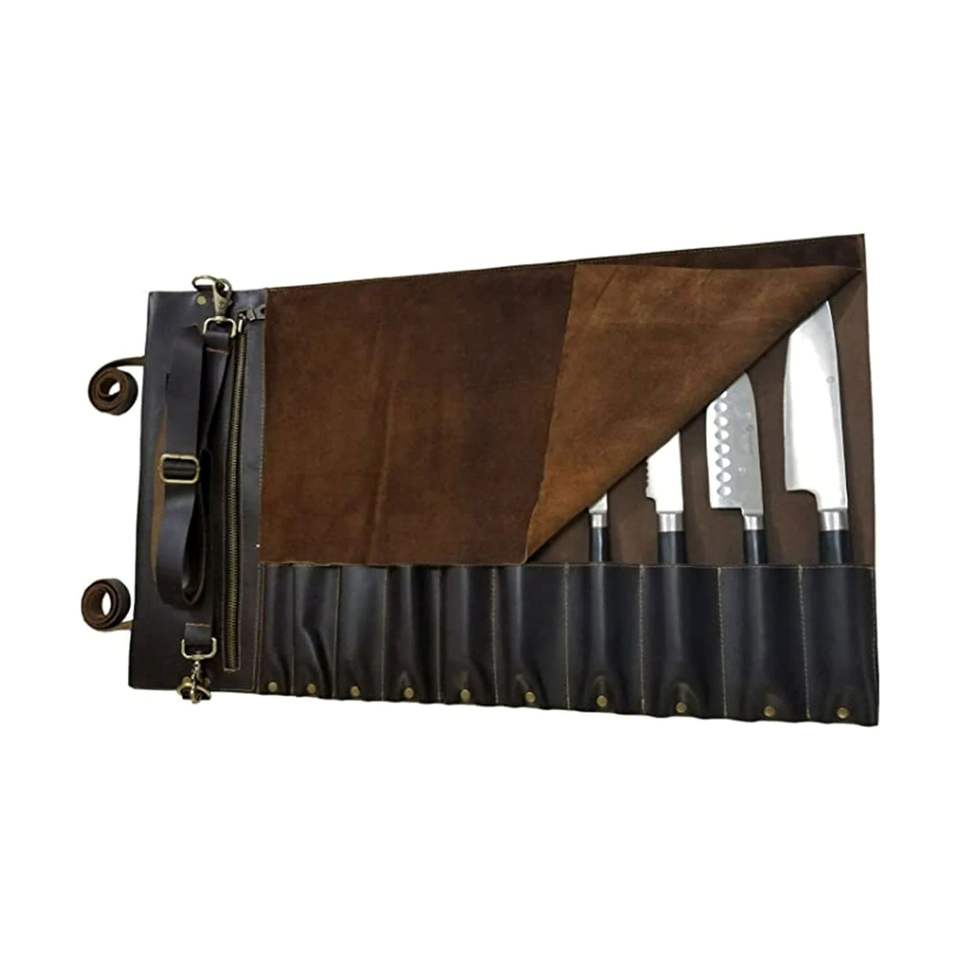 Wholesale Handmade Genuine Leather Knife Roll Bag Durable Chef Knife Case Portable Backpack Style Kitchen Knife Organizer