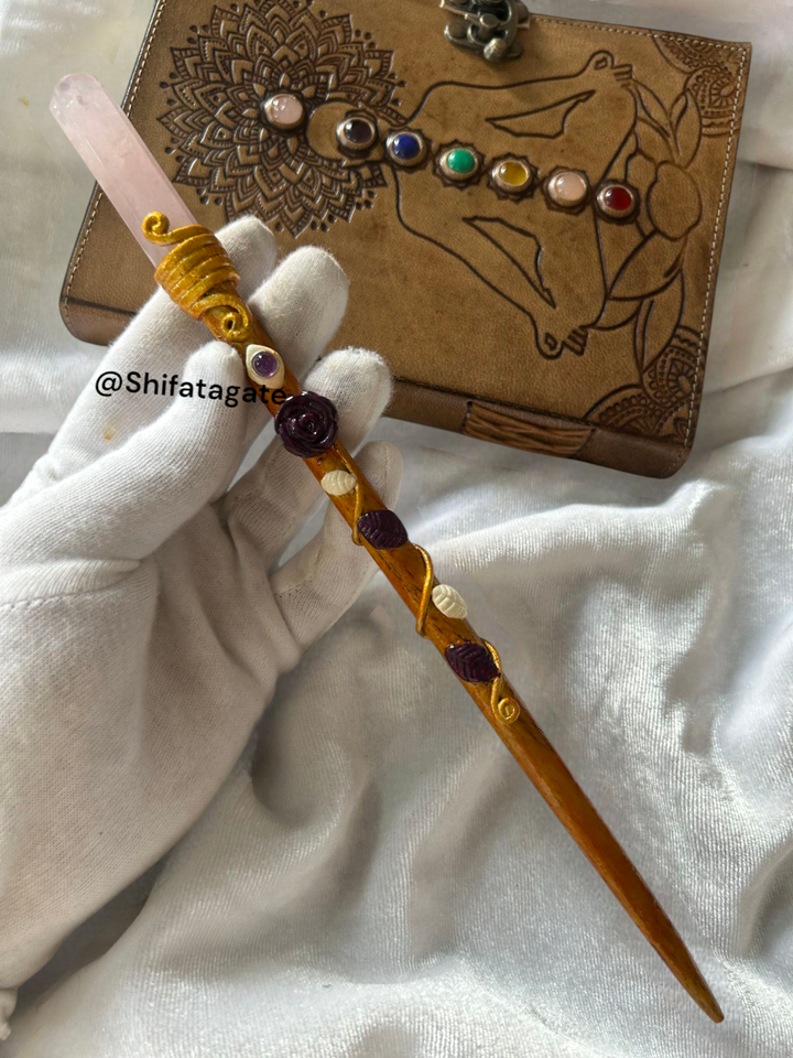 Wholesale Handmade Rose Quartz Crystal Point Wand Love Tower Wooden Magic Wand for Spiritual Healing & Gift Use