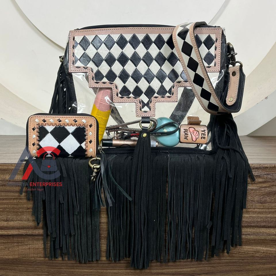 Wholesale Handmade Tooled Leather Fringe Crossbody Checkered PVC Clear Bag & Women's Luxury Hand Tooled Coin Purse Matching Sets