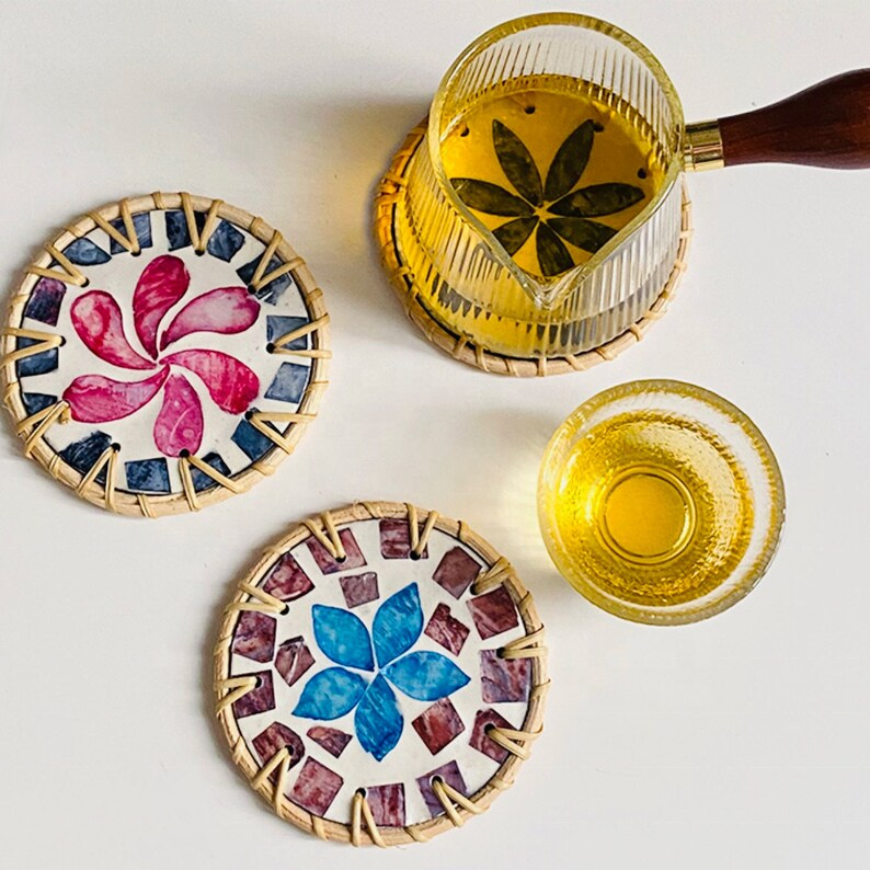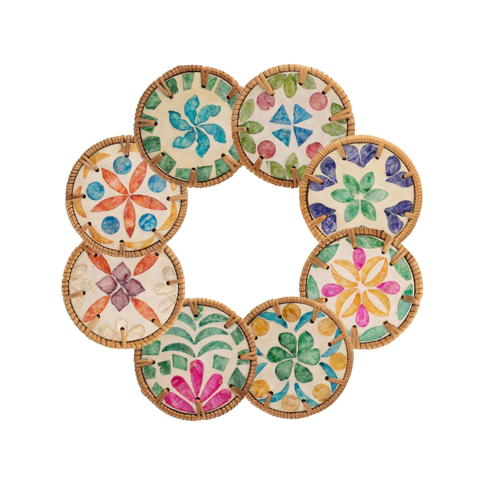 Product name:Mother of Pearl Round Coaster Set with Rattan