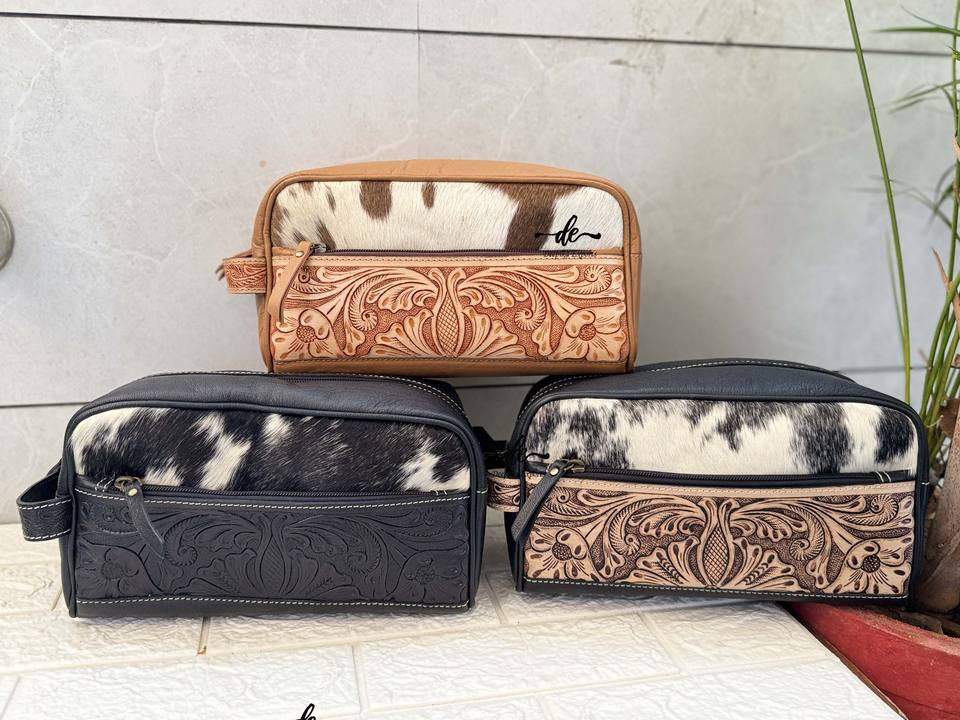 Wholesale High Quality Hand Tooled Leather Toiletry Organizer Women Travel Cosmetic Cowhide Leather Makeup Bags With Handle