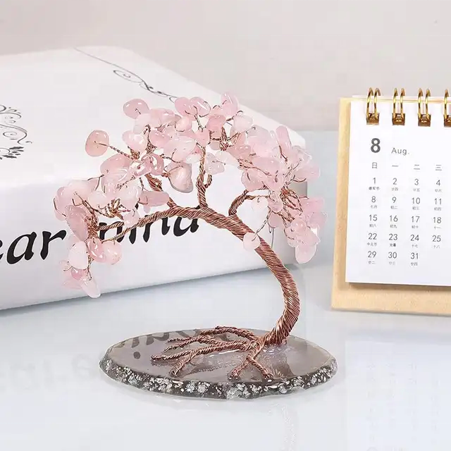 Wholesale High Quality Rose Quartz Crystal Money Tree Agate Slice Base Feng Shui Bonsai Semi-Precious Stone Home Decoration