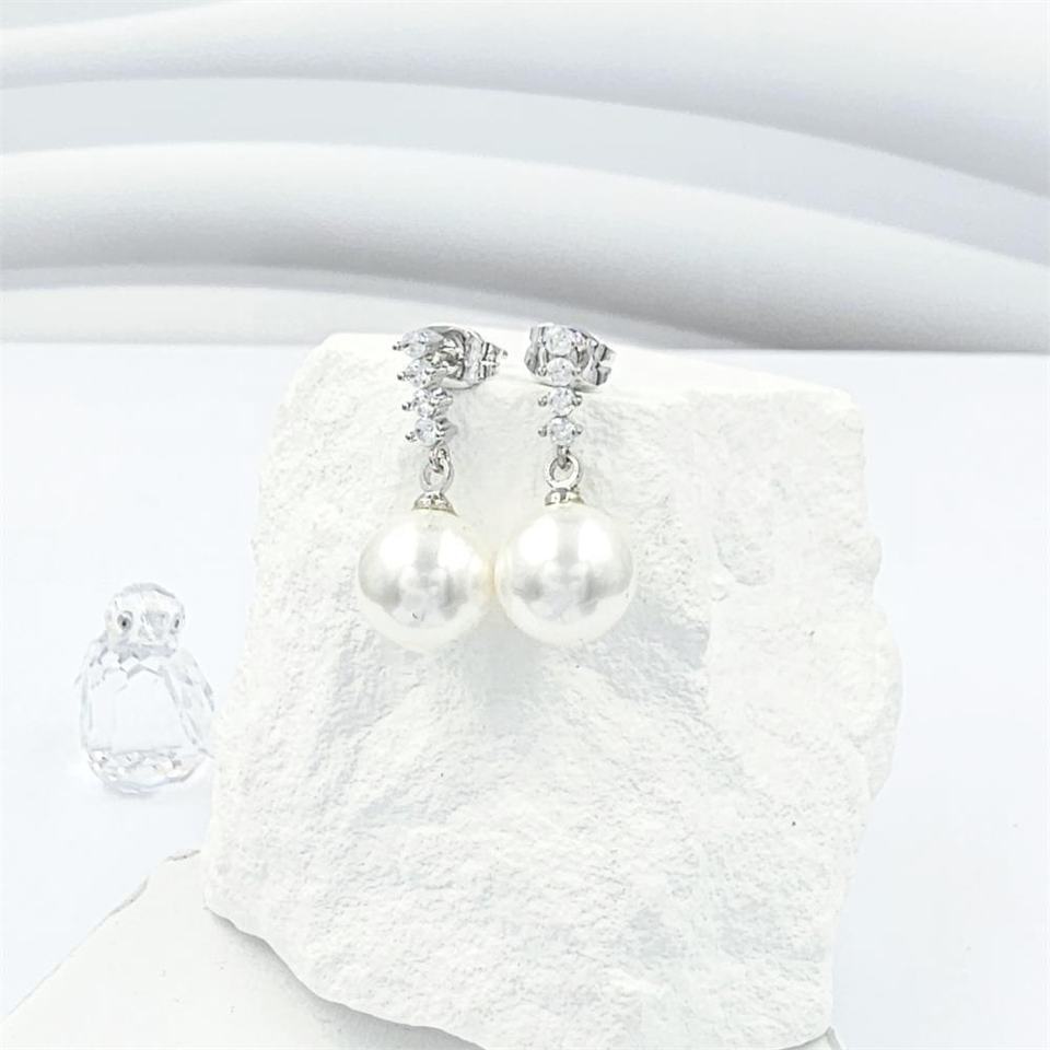 Wholesale High Quality Shiny CZ Glass Pearl Stud Earrings Gold & Rhodium Plated Trendy Brass Jewelry