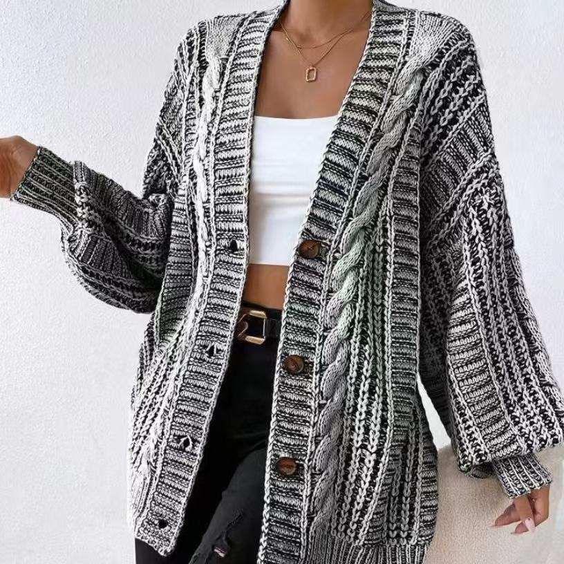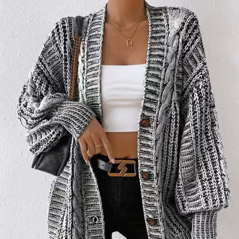 Wholesale High Quality Women's Casual Cardigan Autumn Winter Button Coat with Mixed Colors Lantern Sleeves Long Print Pattern