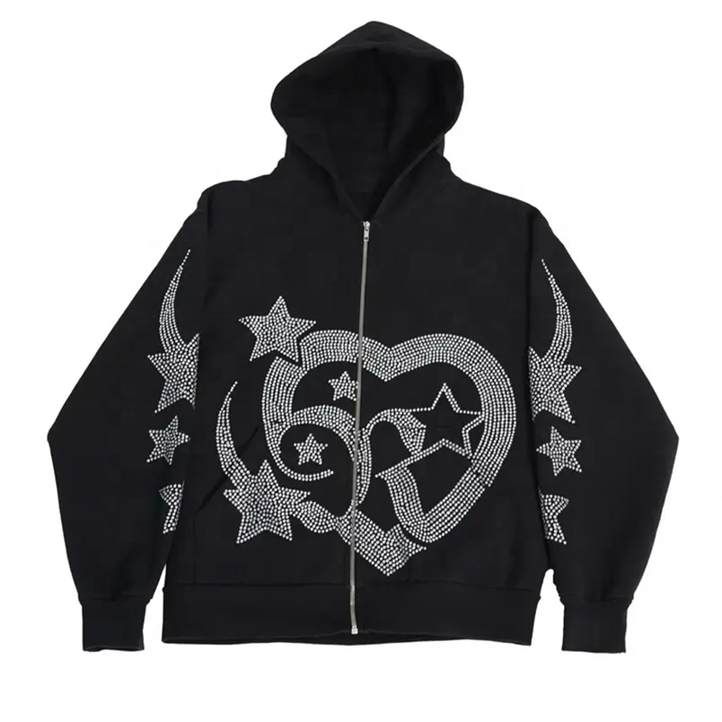 Wholesale Hip Hop Custom Fleece Silver Rhinestone Men's Hoodies & Sweatshirts Full Body Zip up Face Streetwear Men's Hoodies