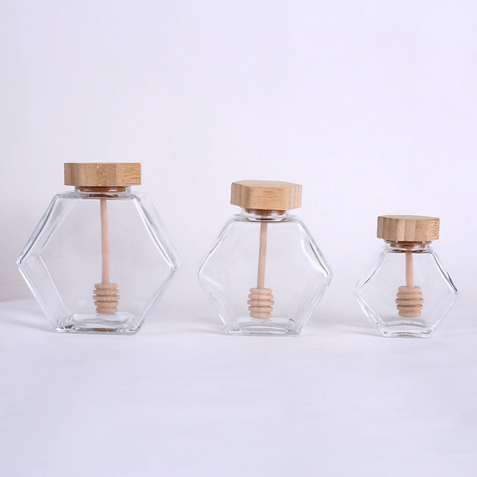 Wholesale Honey Jar Jam Pickle Jelly Food Jar 100ml 220ml 380ml Hot Sale Unique Hexagonal Wood Cap and Sticks Glass Honey Jar