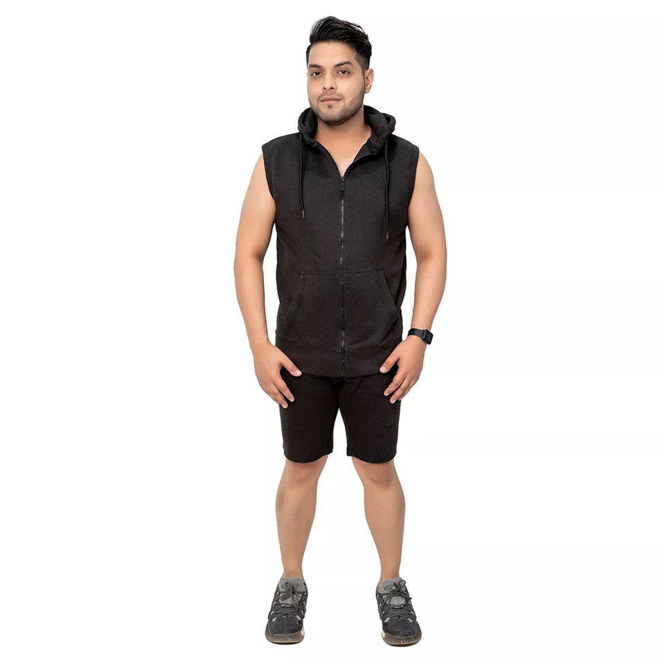 Wholesale Hoodie and Short Sets Black Color Sleeveless Full Zipper up Running and Jogging Wear Men's Hoodies Set