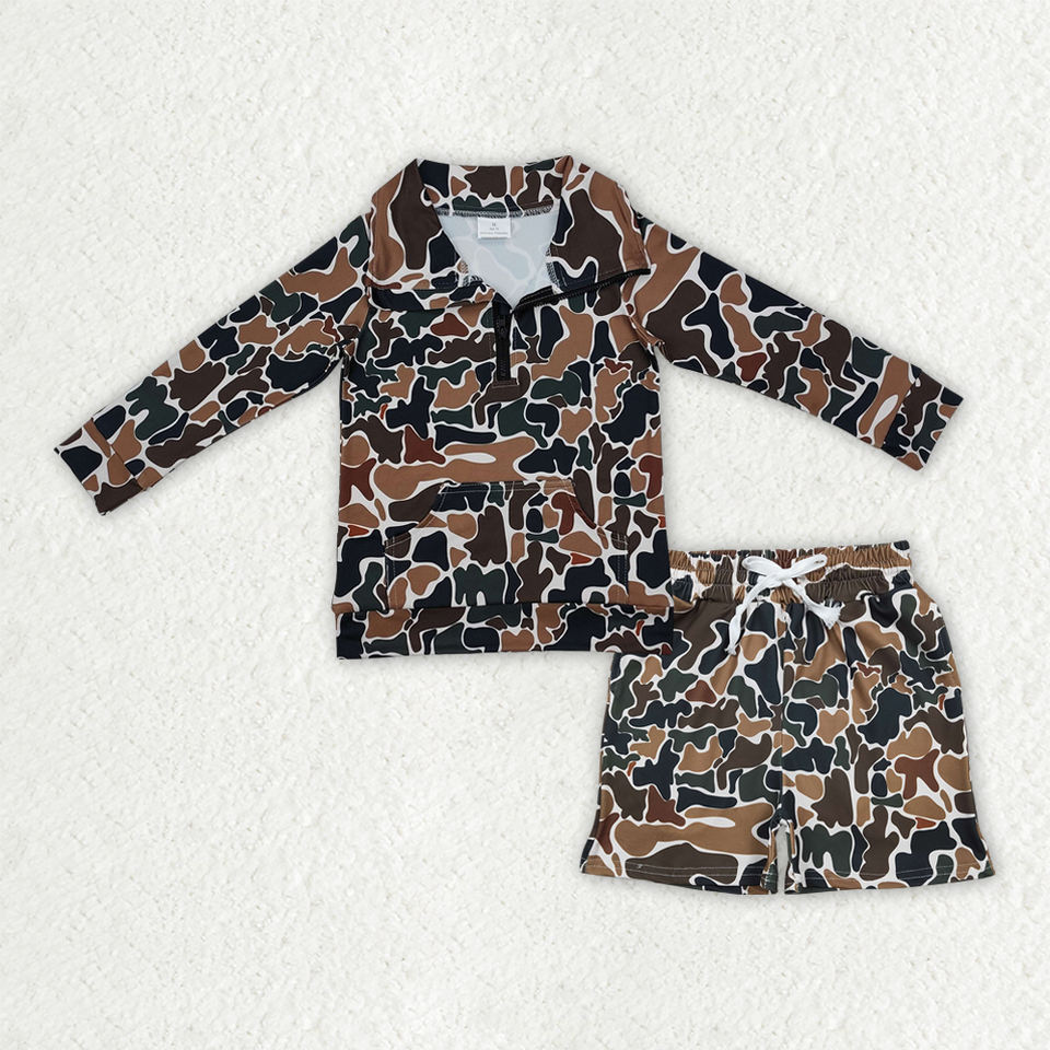 Wholesale Hot Sale High Quality Casual Toddler Boys Long Sleeve Old School Camouflage Pullover Top Shorts Outfit