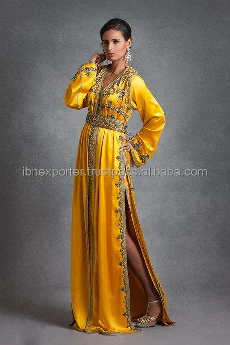 Wholesale Islamic Clothing Muslim Dresses Dubai Beads Jalabiya Yellow Colour Kaftan Abaya Islamic Clothing for Women