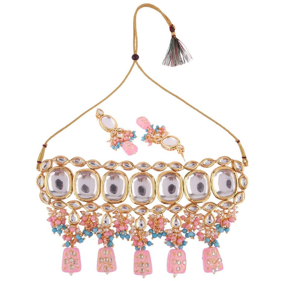 Wholesale Jewellery Indian Kundan Choker Pink Faux Pearl Beaded Dangle Earring For Women