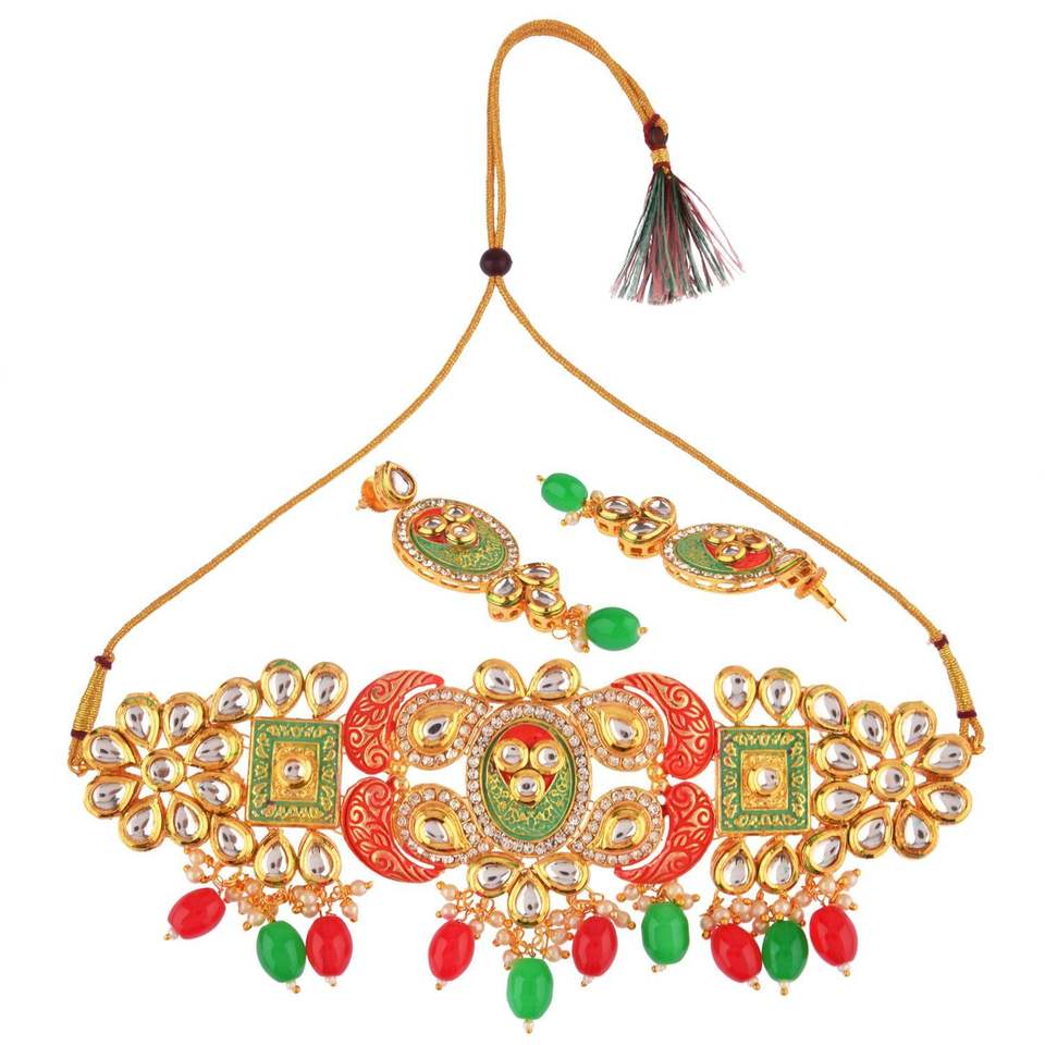 Wholesale Jewelry Crystal Kundan Faux Pearl Beaded Choker Necklace Earrings Enamel Jewelry Set, White