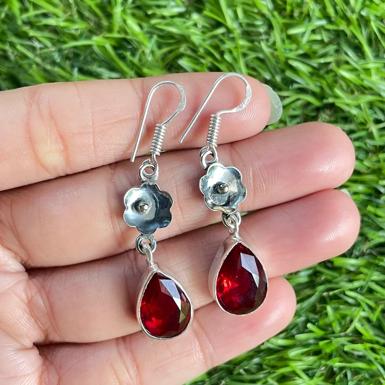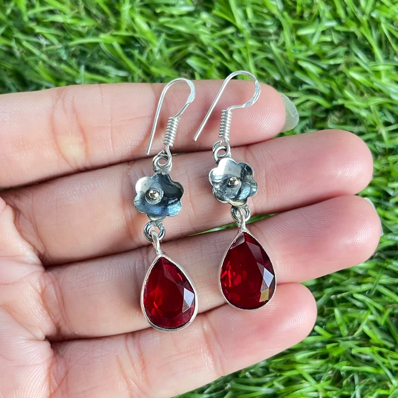 Wholesale 925 Sterling Silver Hoop Earrings with Red Garnet Gemstone Trendy Dangle Drop Design for Women and Girls