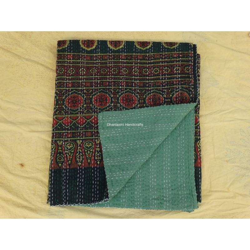 Wholesale Kantha Bedspread Home Decorative Indian Ajrakh Hand Block Print Green Colour Beautiful Handmade Cotton Kantha Quilt