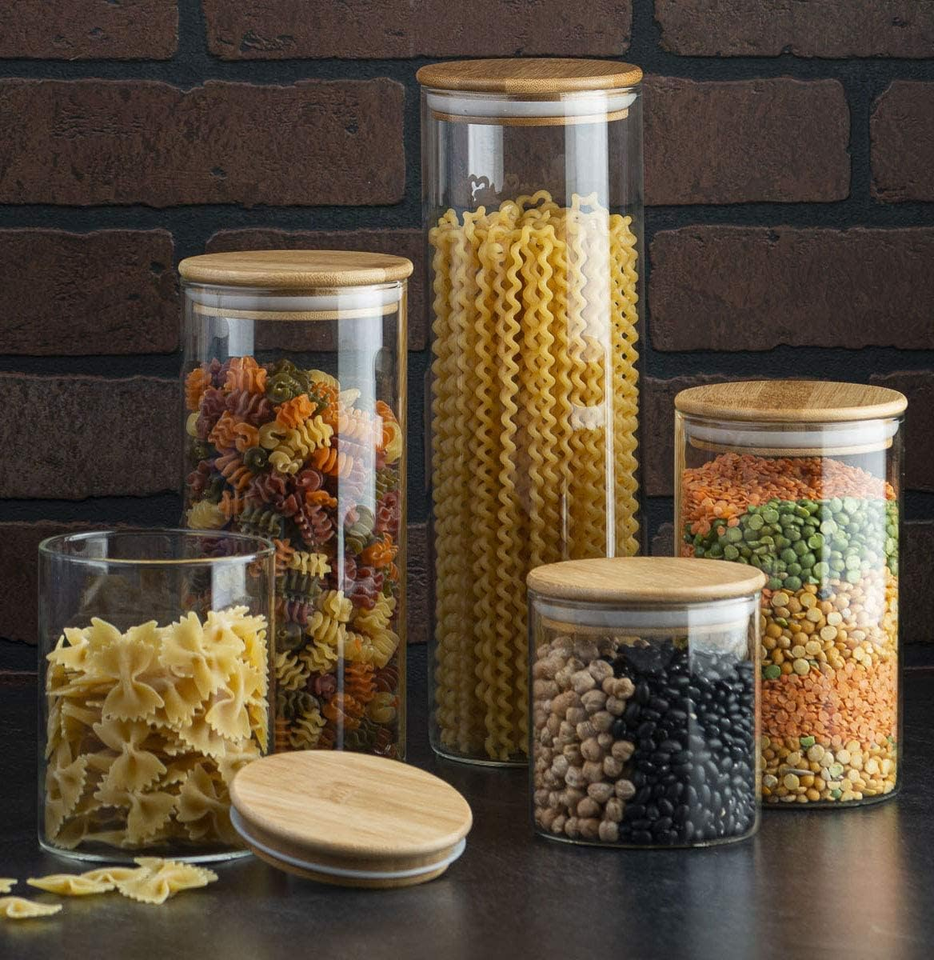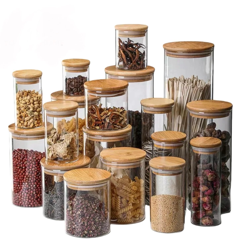 Wholesale Kitchen Canisters Lid for Food Borosilicate Glass Storage Container Jars with Wooden Cover Set of 4