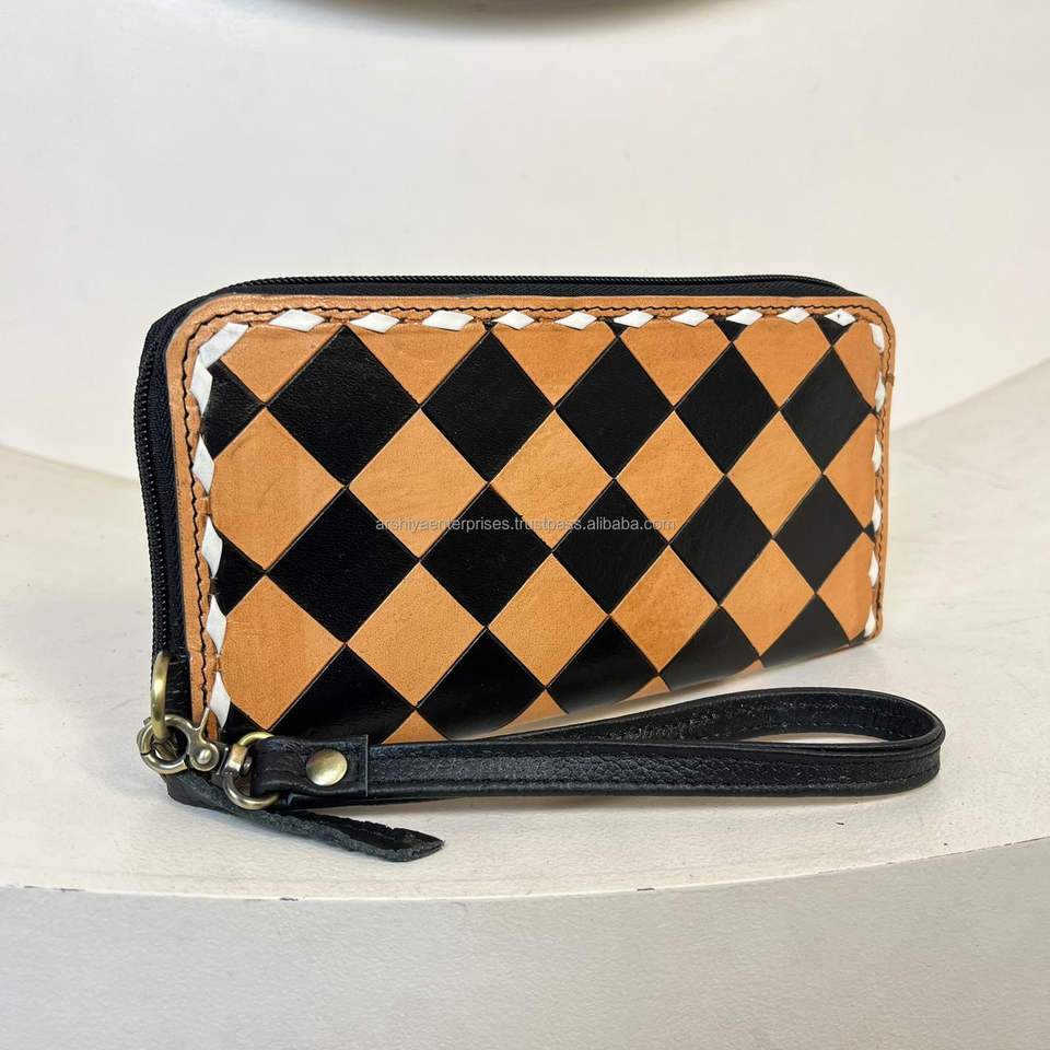 Wholesale Ladies 2 Piece Set Checkered Design Hand Tooled Genuine Leather Handbag & Wristlet Wallet High Quality Set for Women's