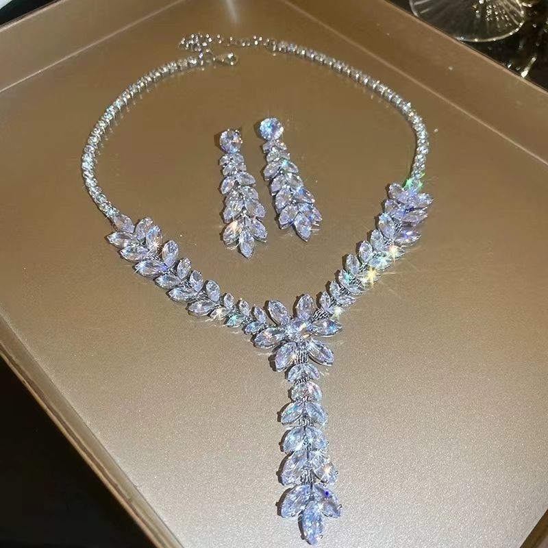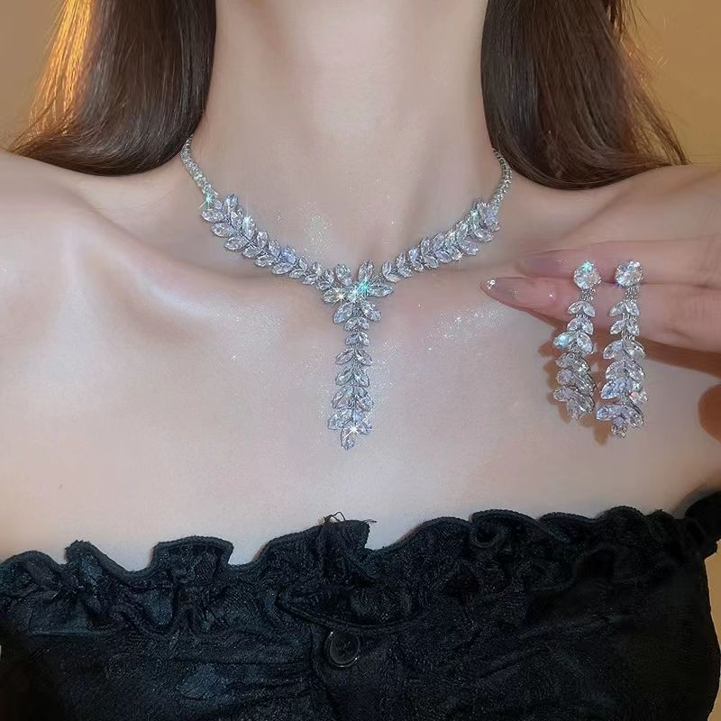 Wholesale Ladies Silver Needle Choker Ear of Wheat Shaped Zircon Tassel Necklace Earrings Jewelry Sets
