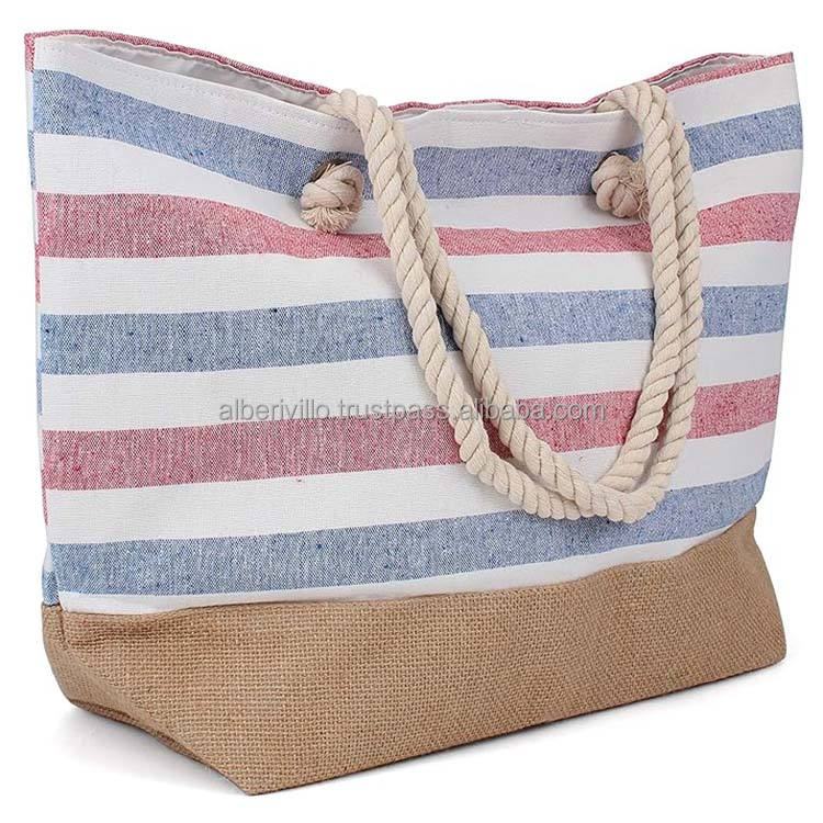 Wholesale Large Blue White Striped Beach Bag Big Oversized Cotton Canvas Shoulder Beach Tote Bag with Cotton Rope Handle