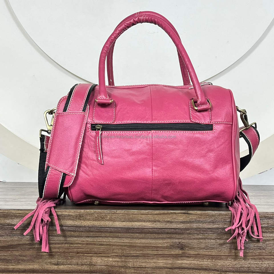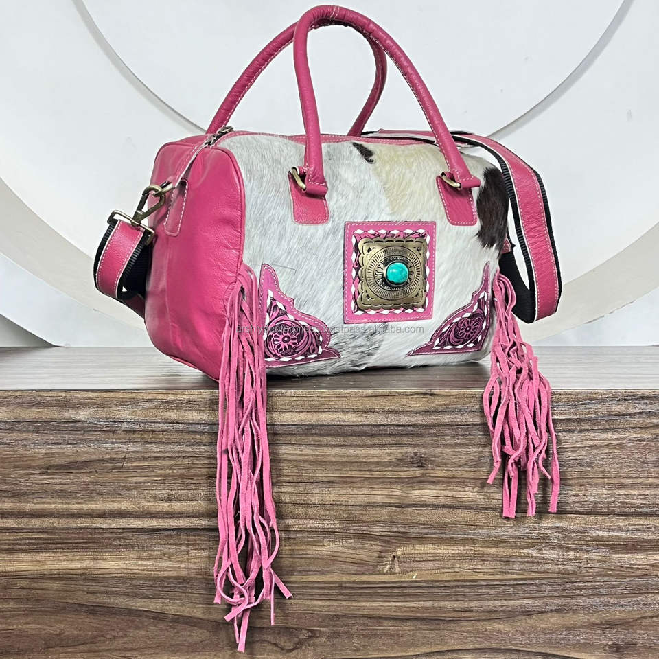 Wholesale Large Capacity Tooled Leather Speedy Crossbody Bag Vintage Genuine Cowhide Leather Fringe Duffel Travel Bags for Women